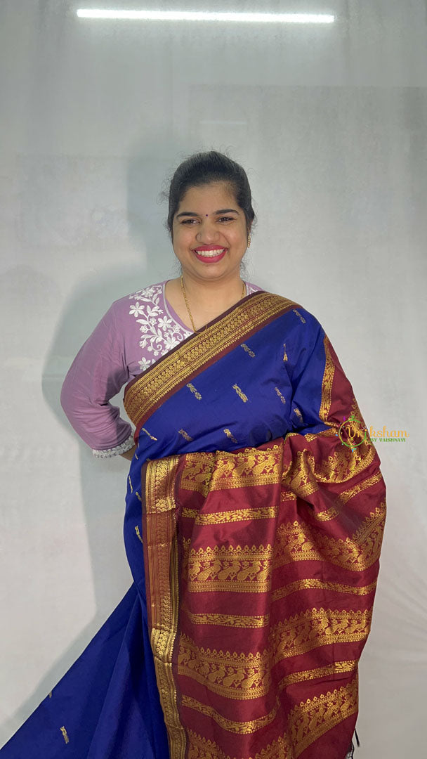 Discover refined sophistication in this Kalyani cotton saree, where a serene blue fabric meets a striking maroon border in perfect harmony. The intricate butta design woven throughout the textile showcases traditional craftsmanship at its finest. Made from premium Kalyani cotton, this saree delivers exceptional comfort and breathability, ideal for prolonged wear during celebrations and formal events. The complementary blue and maroon palette creates a balanced, elegant aesthetic that flatters all complexions. The fabric's natural drape enhances your grace and poise, while the detailed butta motifs add depth and character. A versatile investment piece that seamlessly transitions from festive occasions to cultural gatherings, this saree embodies timeless beauty with authentic heritage appeal.