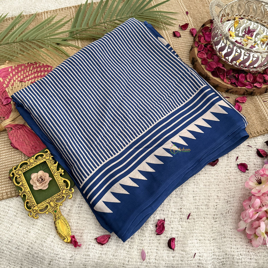 Indulge in pure luxury with our Vriksham Blue Striped Print Ajrakh Modal Silk Saree. Handcrafted with exquisite attention to detail, this saree boasts a unique ajrakh modal design, making it a true masterpiece. Made with premium quality silk, it drapes elegantly and will elevate your wardrobe to new heights.