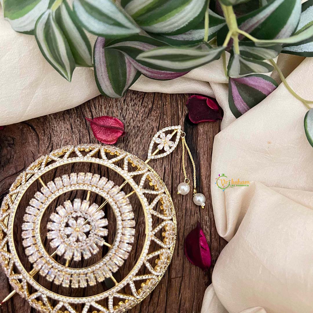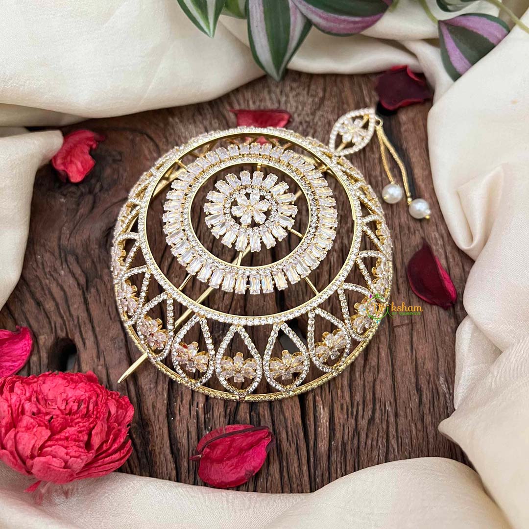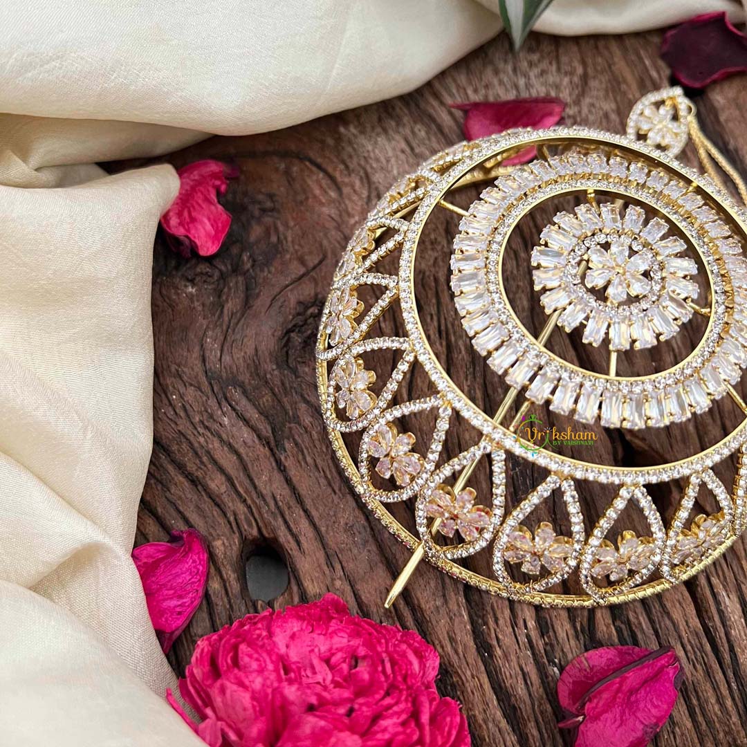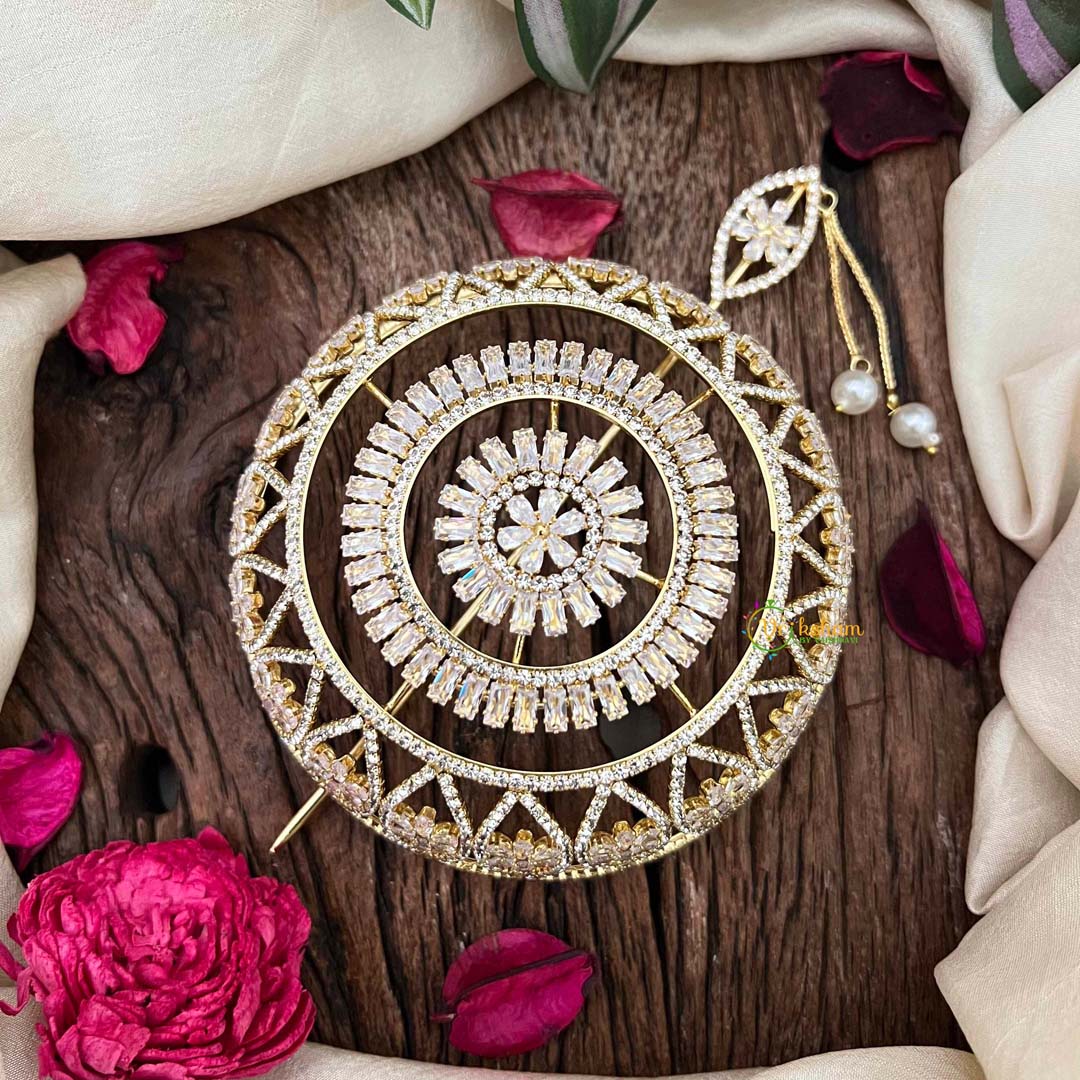 Embrace the splendor of Bollywood with this exquisite gold-touched hair bun cage, a masterpiece inspired by the lavish ornamental heritage of Indian cinema. Embellished with radiant cubic zirconia stones meticulously arranged in an elaborate pattern, this accessory infuses your updo with cinematic glamour and timeless sophistication. The warm gold accents enhance the brilliance of each stone, creating a luminous effect that captures light beautifully. Ideal for weddings, festive celebrations, and special occasions, it transforms your hairstyle into a jeweled crown worthy of the silver screen. Engineered for secure, all-day comfort, this ornament celebrates the artistry of traditional Indian aesthetics with contemporary refinement. A magnificent investment for those who desire bold, luxurious elegance.