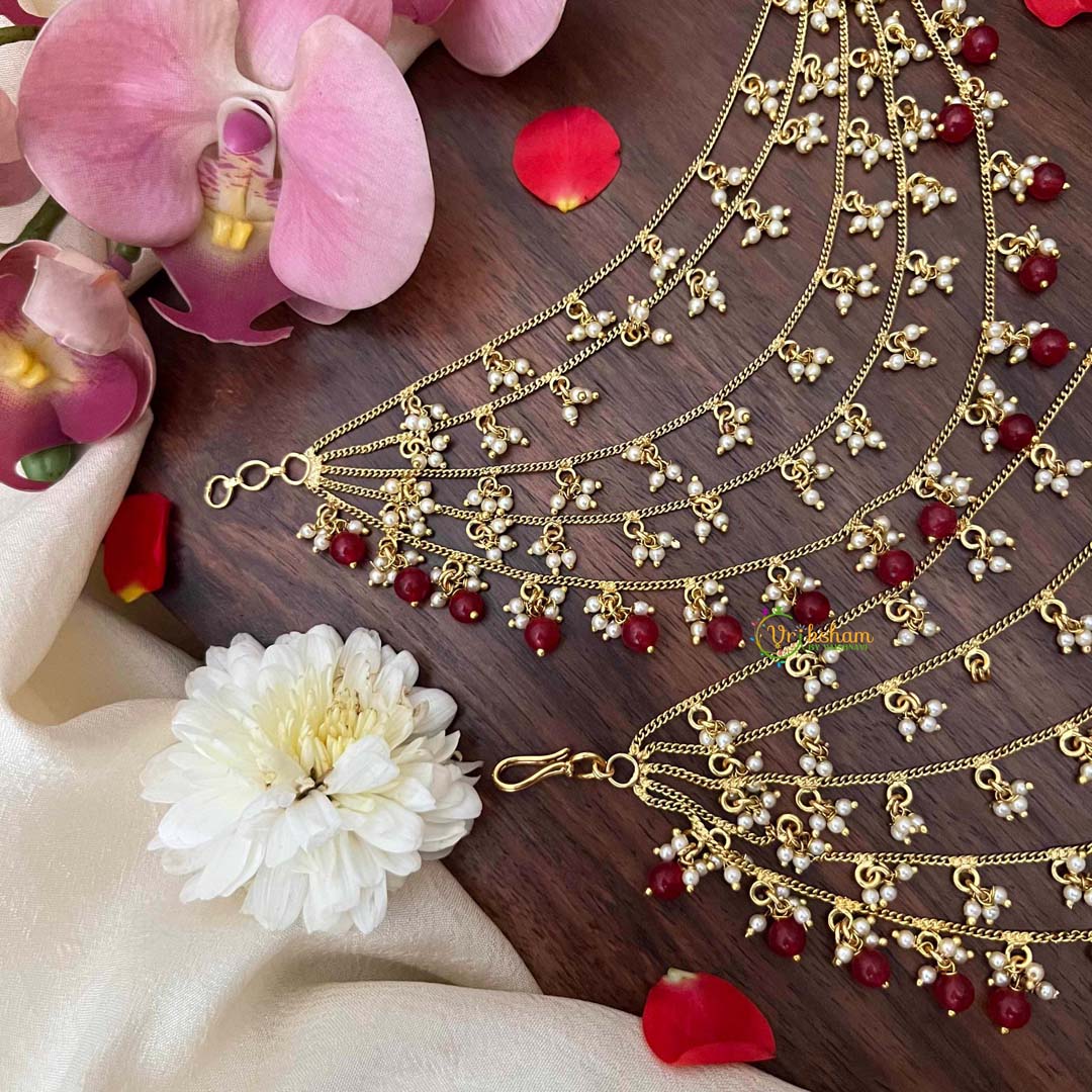 Embrace unparalleled bridal splendor with this magnificent five-layer maatil, a stunning testament to luxury and artistry. Lavishly embellished with royale stones, luminous pearls, and graceful droplets adorned with rich red beads, this piece exudes regal majesty and timeless romance. The intricate multi-layered design creates captivating depth and movement, while each jeweled element sparkles with breathtaking brilliance. Ideal for weddings, engagements, and your most treasured celebrations, this accessory makes an unforgettable statement of elegance and cultural pride. A truly precious heirloom piece that honors your most radiant moments.