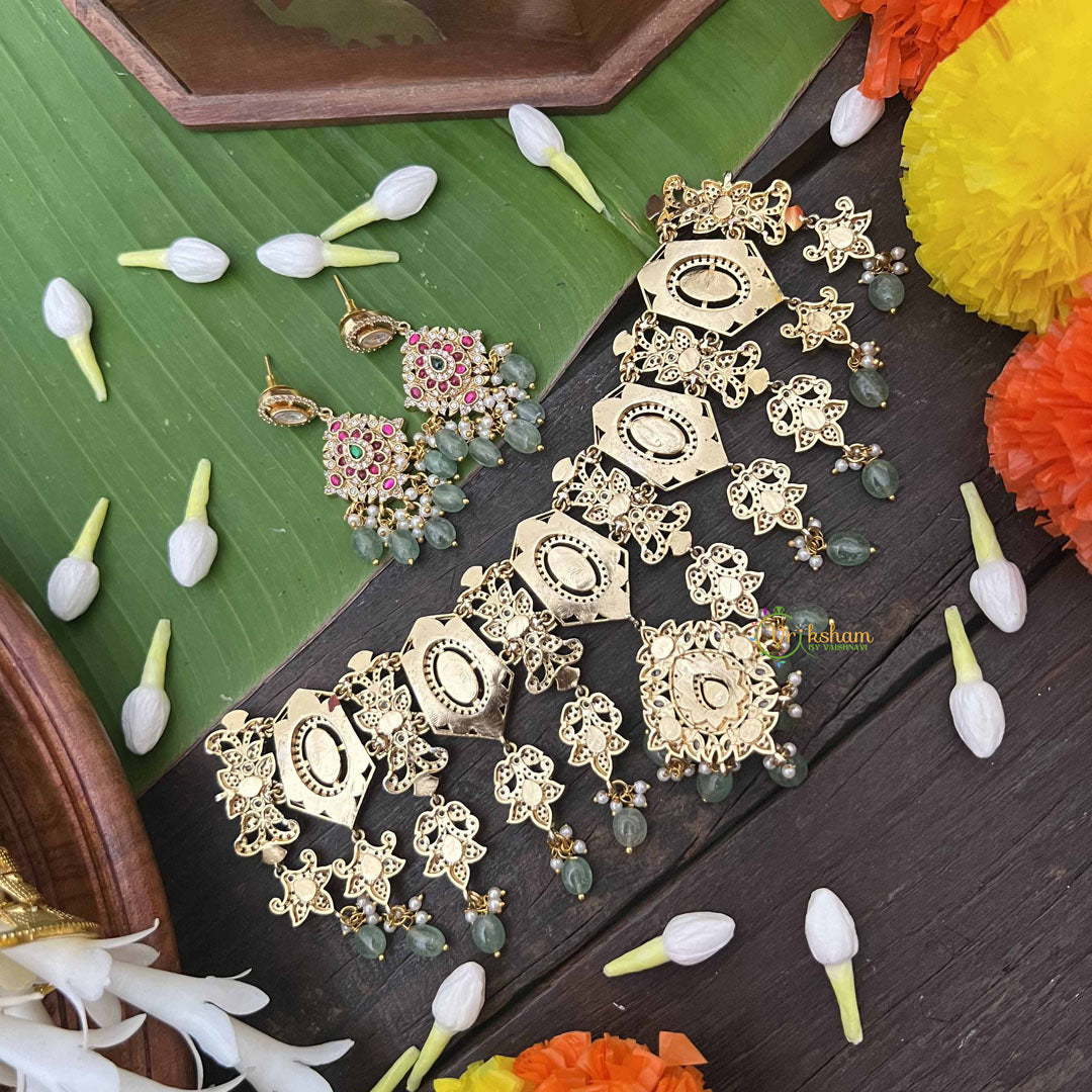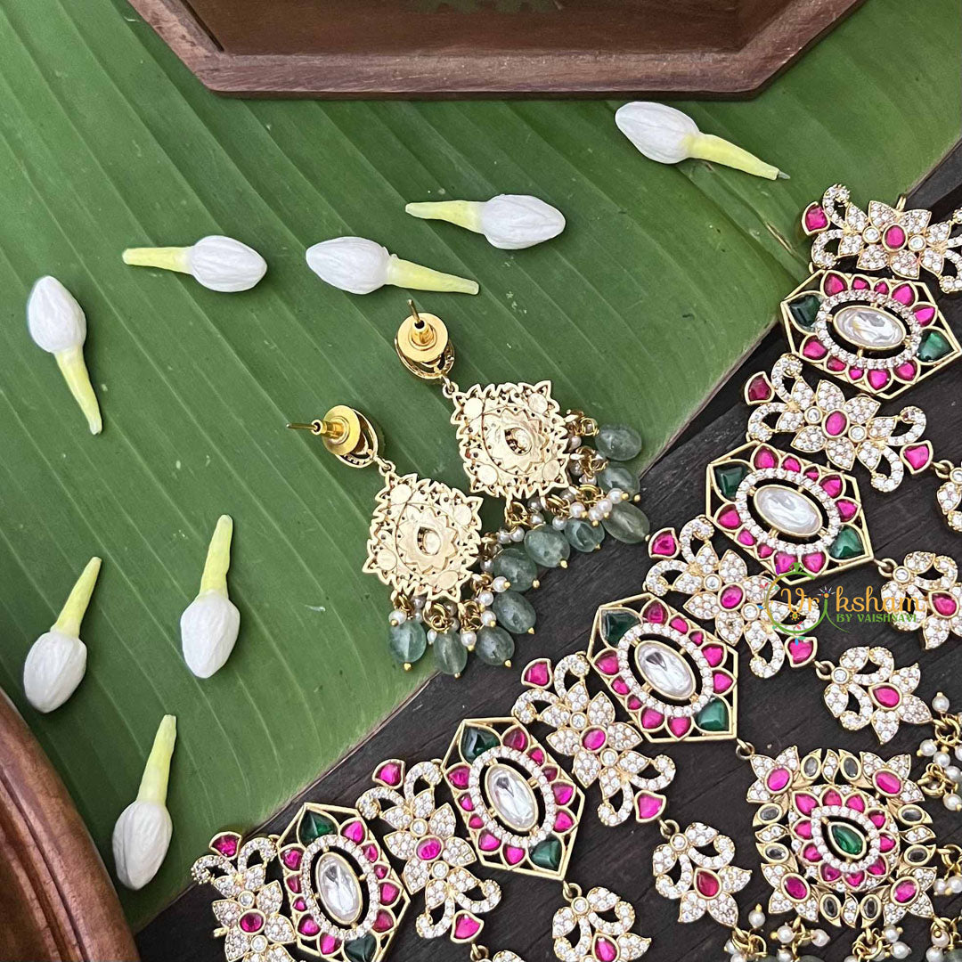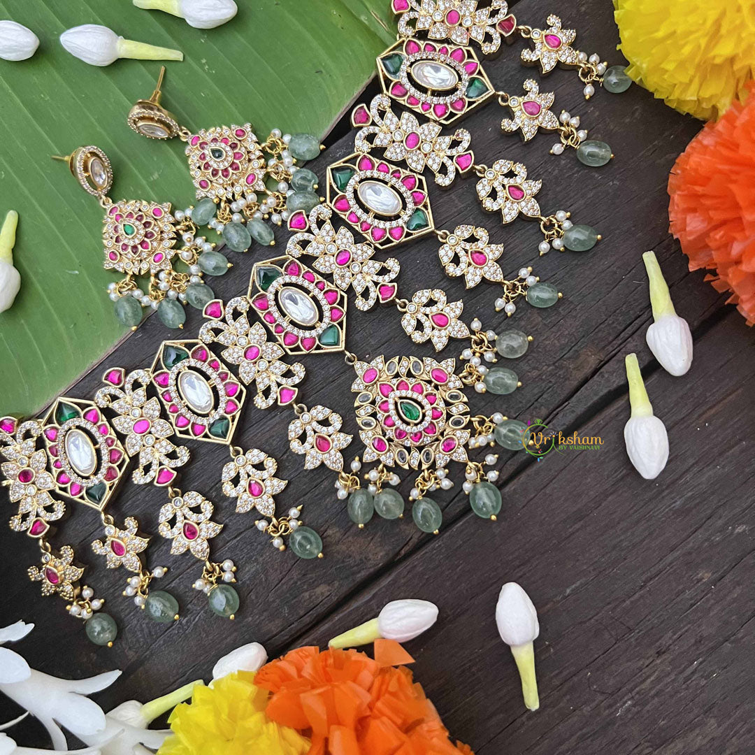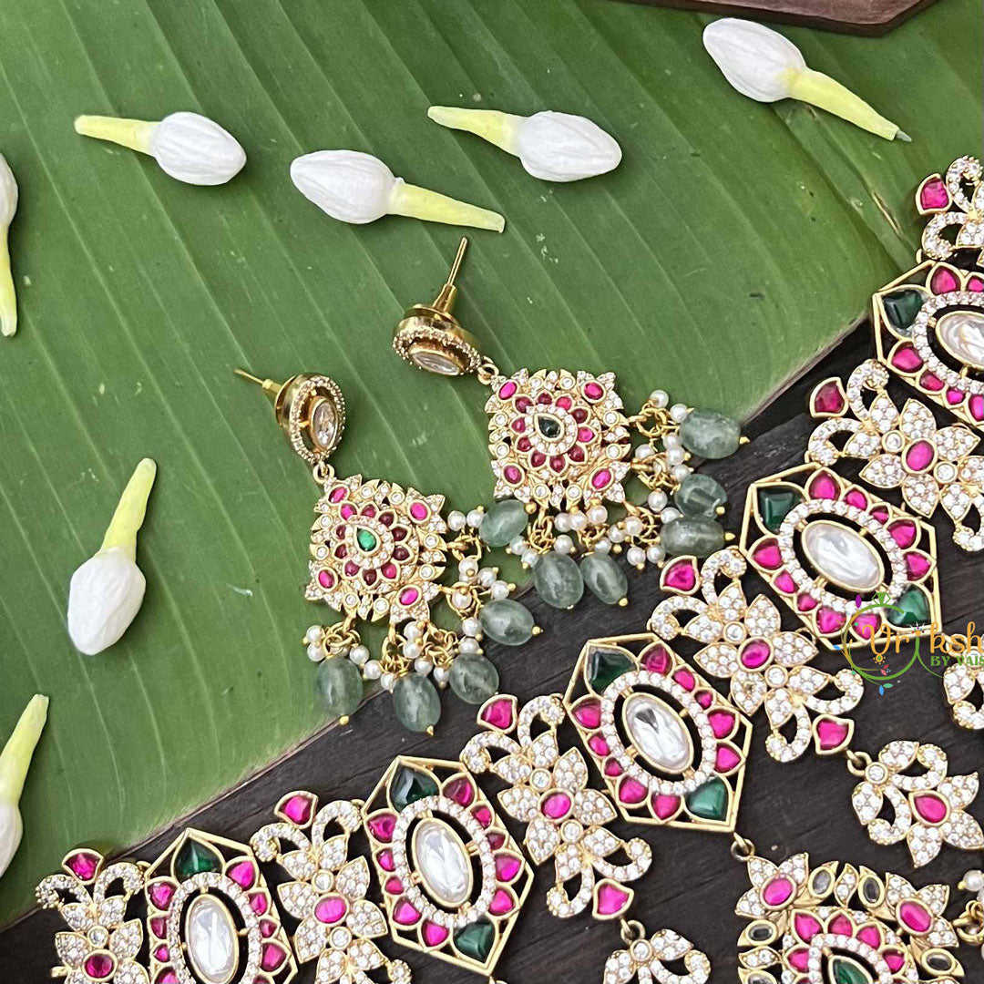 Embrace timeless bridal elegance with this captivating AD stone choker, a symphony of color and craftsmanship. The jewel-toned palette of deep red, lush green, and luminous white stones creates a mesmerizing visual harmony, anchored by verdant green beads that echo traditional aesthetics. Each stone is meticulously set to catch light and enhance your complexion, while the choker's close-fitting design flatters the neckline with graceful sophistication. Perfect for brides seeking a statement piece that honors heritage while exuding contemporary refinement and enduring beauty.