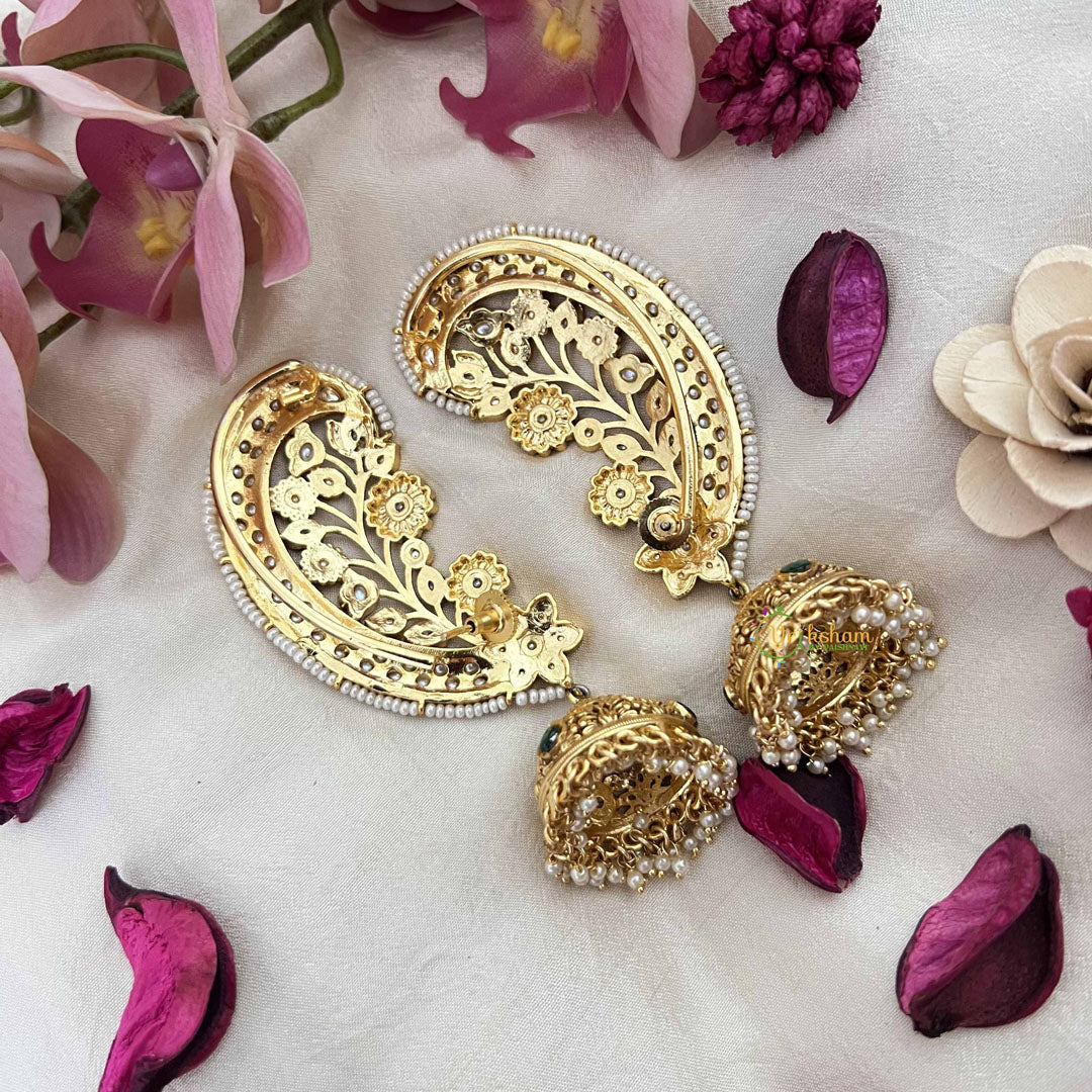 Color, shades, texture displayed may slightly vary from the actual product due to photography limitations. We humbly request you to consider these variations. We try Elevate your elegance with the Vriksham Royal Peacock Kundan Jadau Jhumkas, exquisitely crafted with intricate peacock motifs and adorned with lustrous pearls. The detailed maatil design is complemented by matching ear cuffs, creating a harmonious and regal accessory set perfect for special occasions. This sophisticated jewelry merges traditional craftsmanship with timeless beauty, enhancing your ensemble with a graceful, luxurious touch.our best to deliver the product pictures to 99% similar to the actual product. BEWARE of IMAGE RE-USAGE/COPYRIGHT VIOLATION across the INTERNET. This image belongs to www.vrikshamindia.com only. It is authentically taken by our in-house photographers in natural light without any editing or filters in place and is copyrighted to us. Any stealing/infringement or usage of this pic for sales/advertisement purposes is subject to legal action.