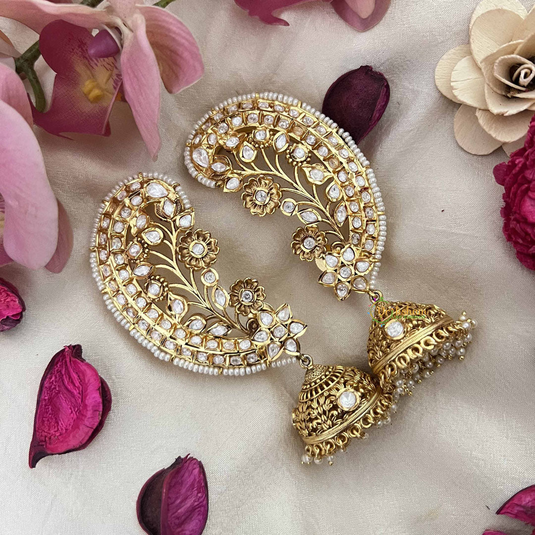 Color, shades, texture displayed may slightly vary from the actual product due to photography limitations. We humbly request you to consider these variations. We try Elevate your elegance with the Vriksham Royal Peacock Kundan Jadau Jhumkas, exquisitely crafted with intricate peacock motifs and adorned with lustrous pearls. The detailed maatil design is complemented by matching ear cuffs, creating a harmonious and regal accessory set perfect for special occasions. This sophisticated jewelry merges traditional craftsmanship with timeless beauty, enhancing your ensemble with a graceful, luxurious touch.our best to deliver the product pictures to 99% similar to the actual product. BEWARE of IMAGE RE-USAGE/COPYRIGHT VIOLATION across the INTERNET. This image belongs to www.vrikshamindia.com only. It is authentically taken by our in-house photographers in natural light without any editing or filters in place and is copyrighted to us. Any stealing/infringement or usage of this pic for sales/advertisement purposes is subject to legal action.