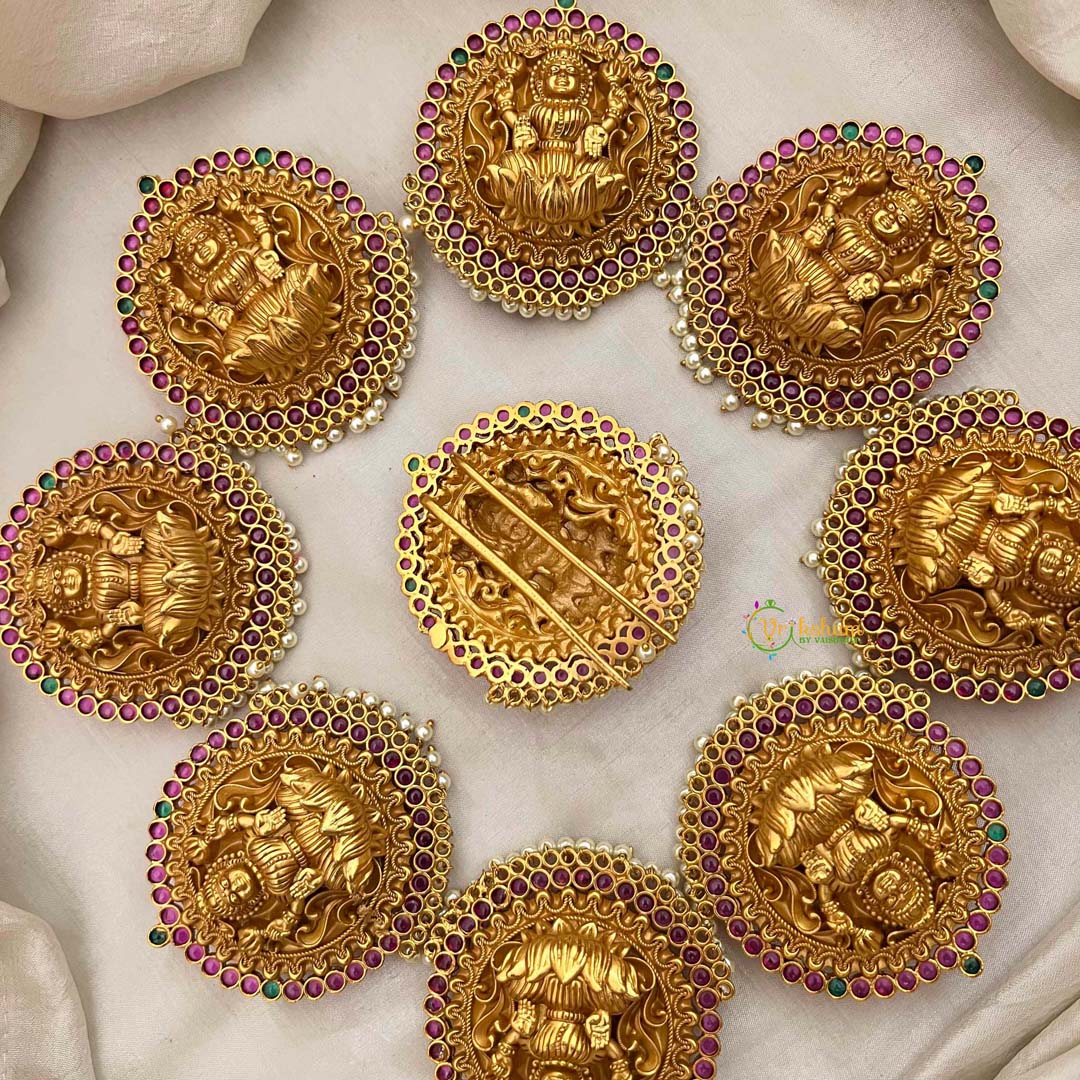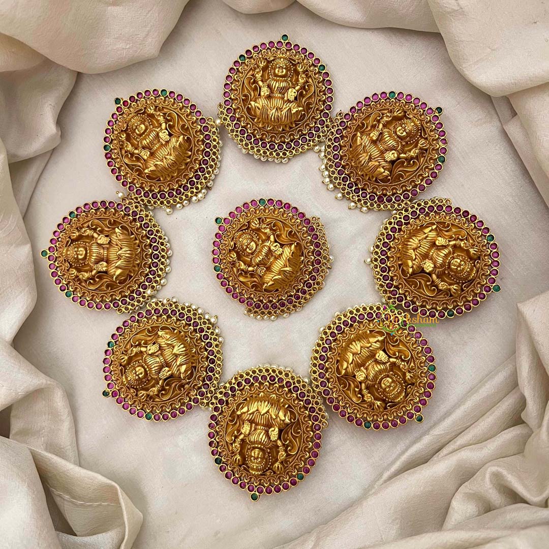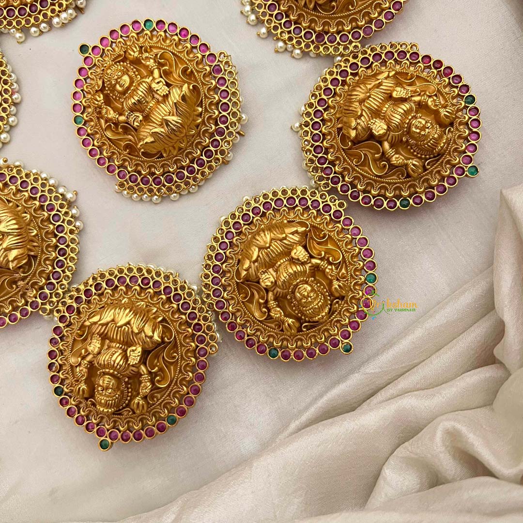Radiate divine grace with this exquisite bridal jada bilai, a masterpiece honoring the goddess Lakshmi. Featuring seven intricately crafted segments in antique temple finish, this hair ornament showcases the sacred Lakshmi motif adorned with lustrous pearls and vibrant red and green accents. Each segment is meticulously designed to cascade elegantly through your hair, creating a regal silhouette that captures timeless spiritual beauty. Perfect for bridal ceremonies, festive occasions, or when you seek to embody goddess-like elegance, this piece merges devotional artistry with sophisticated craftsmanship. An heirloom-worthy accessory that celebrates cultural heritage and feminine radiance.