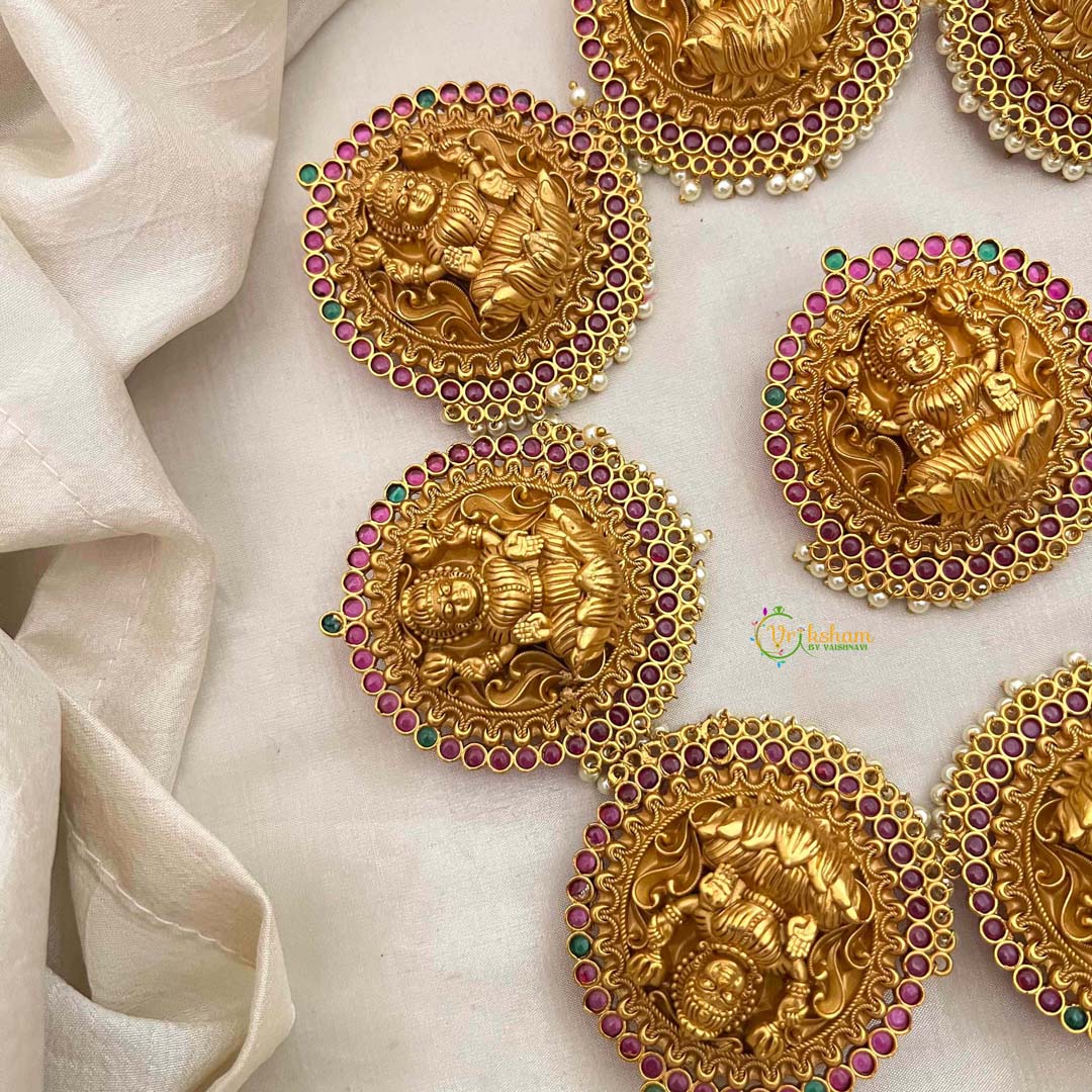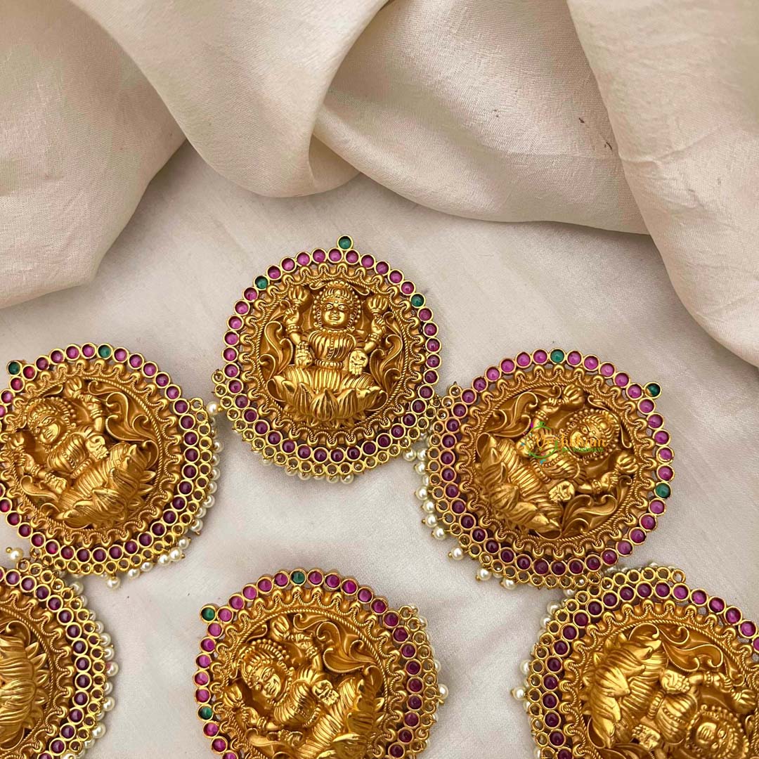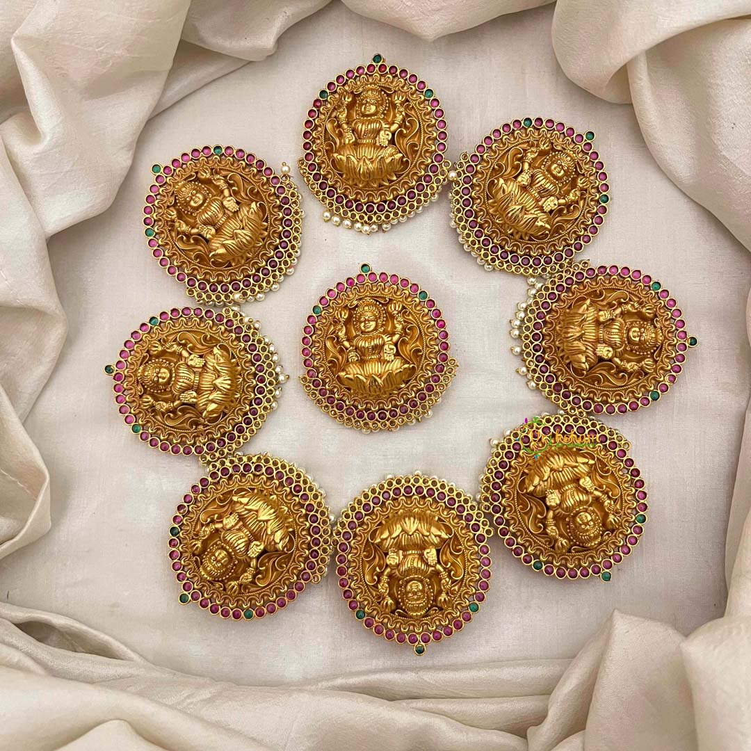 Radiate divine grace with this exquisite bridal jada bilai, a masterpiece honoring the goddess Lakshmi. Featuring seven intricately crafted segments in antique temple finish, this hair ornament showcases the sacred Lakshmi motif adorned with lustrous pearls and vibrant red and green accents. Each segment is meticulously designed to cascade elegantly through your hair, creating a regal silhouette that captures timeless spiritual beauty. Perfect for bridal ceremonies, festive occasions, or when you seek to embody goddess-like elegance, this piece merges devotional artistry with sophisticated craftsmanship. An heirloom-worthy accessory that celebrates cultural heritage and feminine radiance.