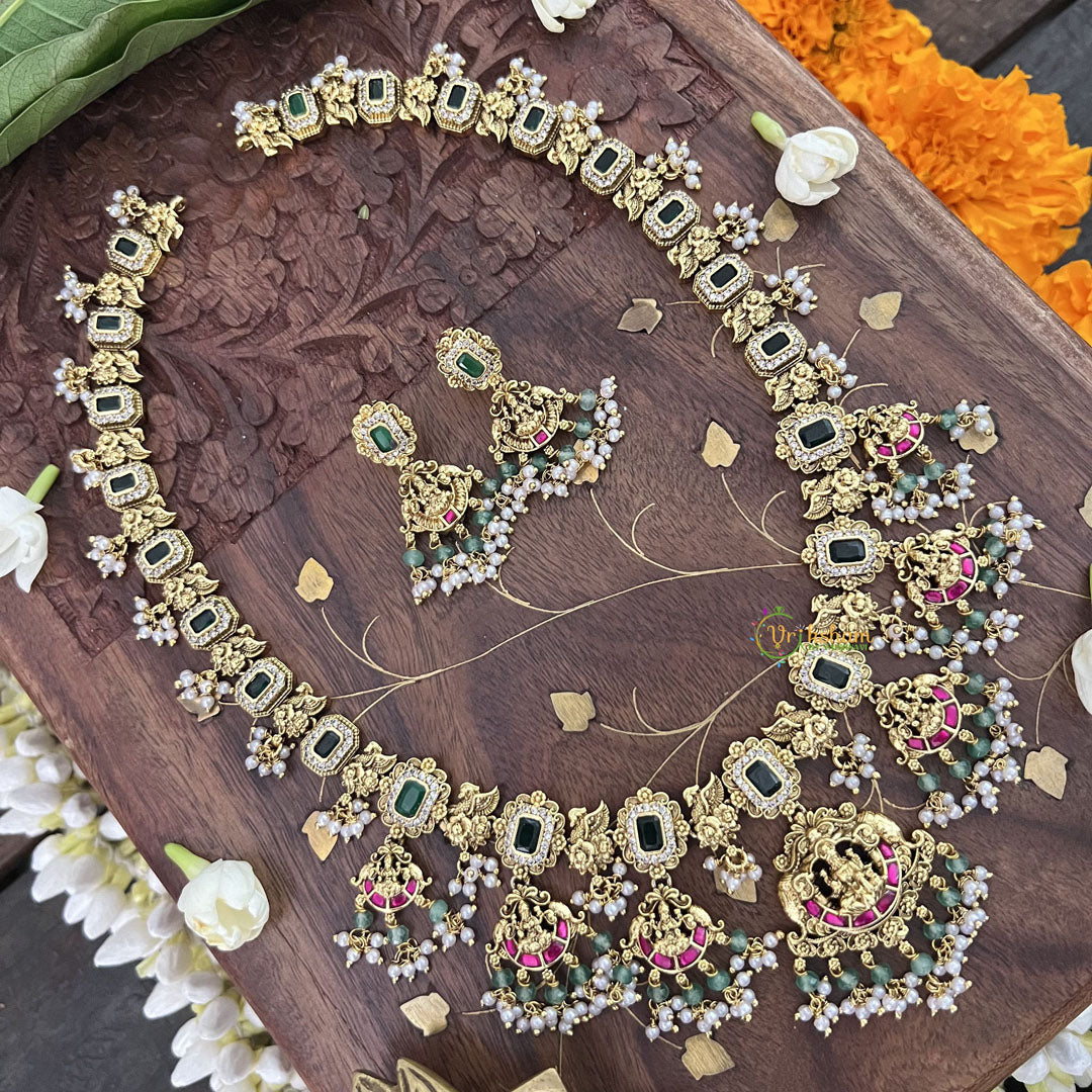 The Vriksham Bridal Green Shade Lakshmi Style Kundan Jadau Long Choker, embellished with elegant pearls, offers a majestic blend of tradition and sophistication. Featuring the revered Lakshmi motif in a rich green hue, this intricately crafted long choker enhances bridal attire with timeless grace and cultural significance, making it a perfect statement piece for your special day.