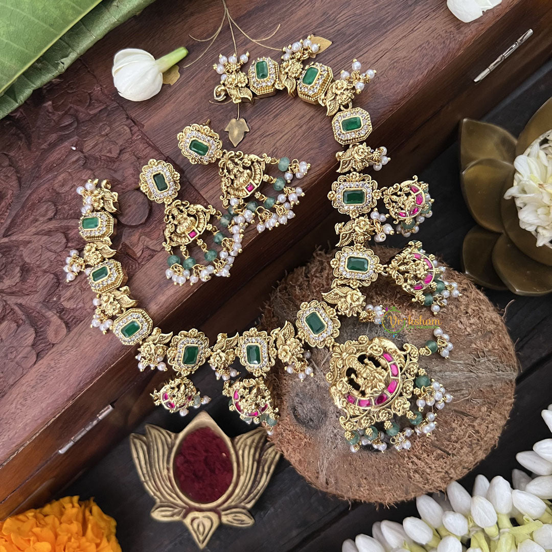 The Vriksham Bridal Green Shade Lakshmi Style Kundan Jadau Short Choker, adorned with lustrous pearls, beautifully merges traditional elegance with bridal sophistication. Featuring the iconic Lakshmi motif in a graceful green shade, this choker is meticulously crafted to add a regal touch to your wedding ensemble, embodying timeless beauty and cultural richness.
