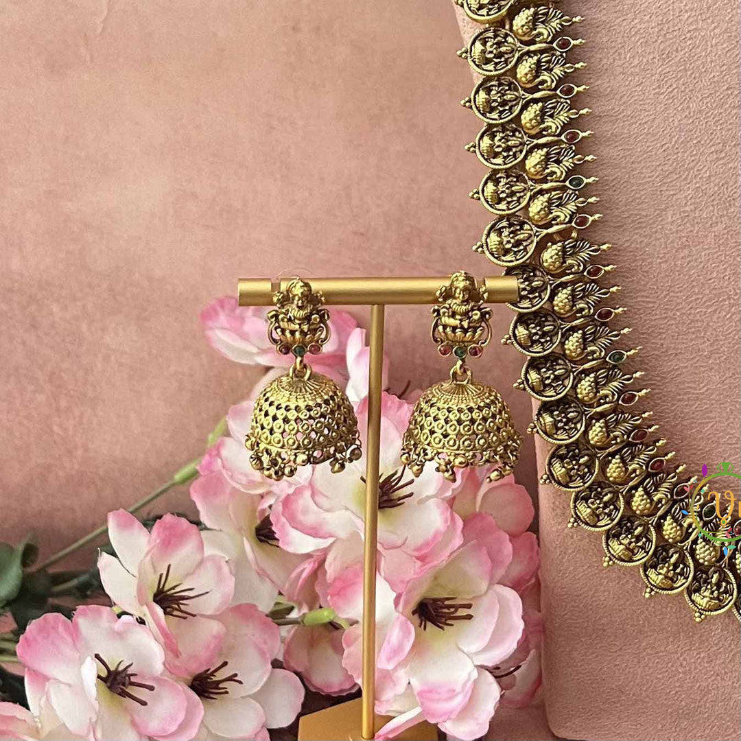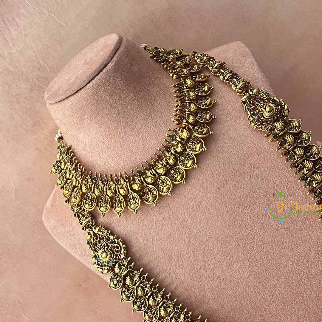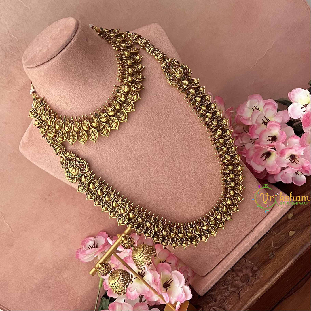 Celebrate auspicious beauty with this stunning Lakshmi Coin Style Peacock Bridal Set, where divine symbolism meets exquisite craftsmanship. Featuring ornate peacock designs embellished with sacred Lakshmi coin motifs, this set showcases a captivating palette of deep red and verdant green tones. Each piece is thoughtfully designed to honor traditional bridal aesthetics while delivering sophisticated elegance. The intricate detailing and premium finish make this ensemble an ideal choice for brides seeking meaningful jewelry that reflects cultural heritage and refined taste for their most cherished moments.