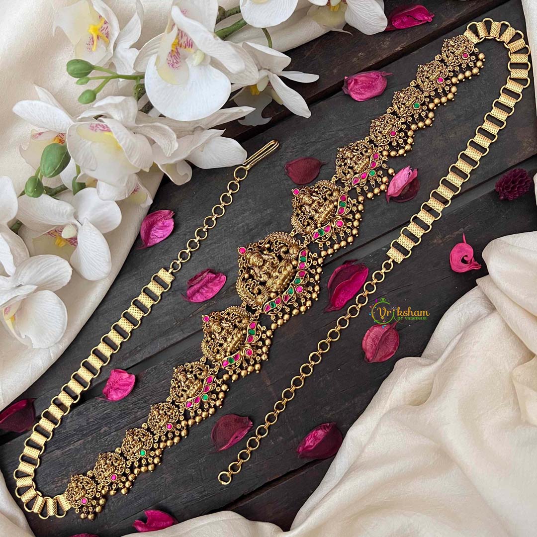 Radiate divine grace with this exquisite Bridal Lakshmi Idol Hipchain, a celebration of prosperity and elegance. Featuring a captivating blend of red and green hues complemented by lustrous gold beads, this piece honors the goddess of wealth and abundance. The central Lakshmi idol serves as a powerful focal point, while the surrounding beadwork creates a harmonious, flowing design that drapes beautifully along the hips. Crafted with meticulous attention to detail, this hipchain seamlessly merges spiritual significance with bridal sophistication. Perfect for brides seeking a meaningful accessory that embodies cultural heritage and timeless beauty, transforming any traditional or fusion bridal look into a statement of refined elegance and auspicious blessings.