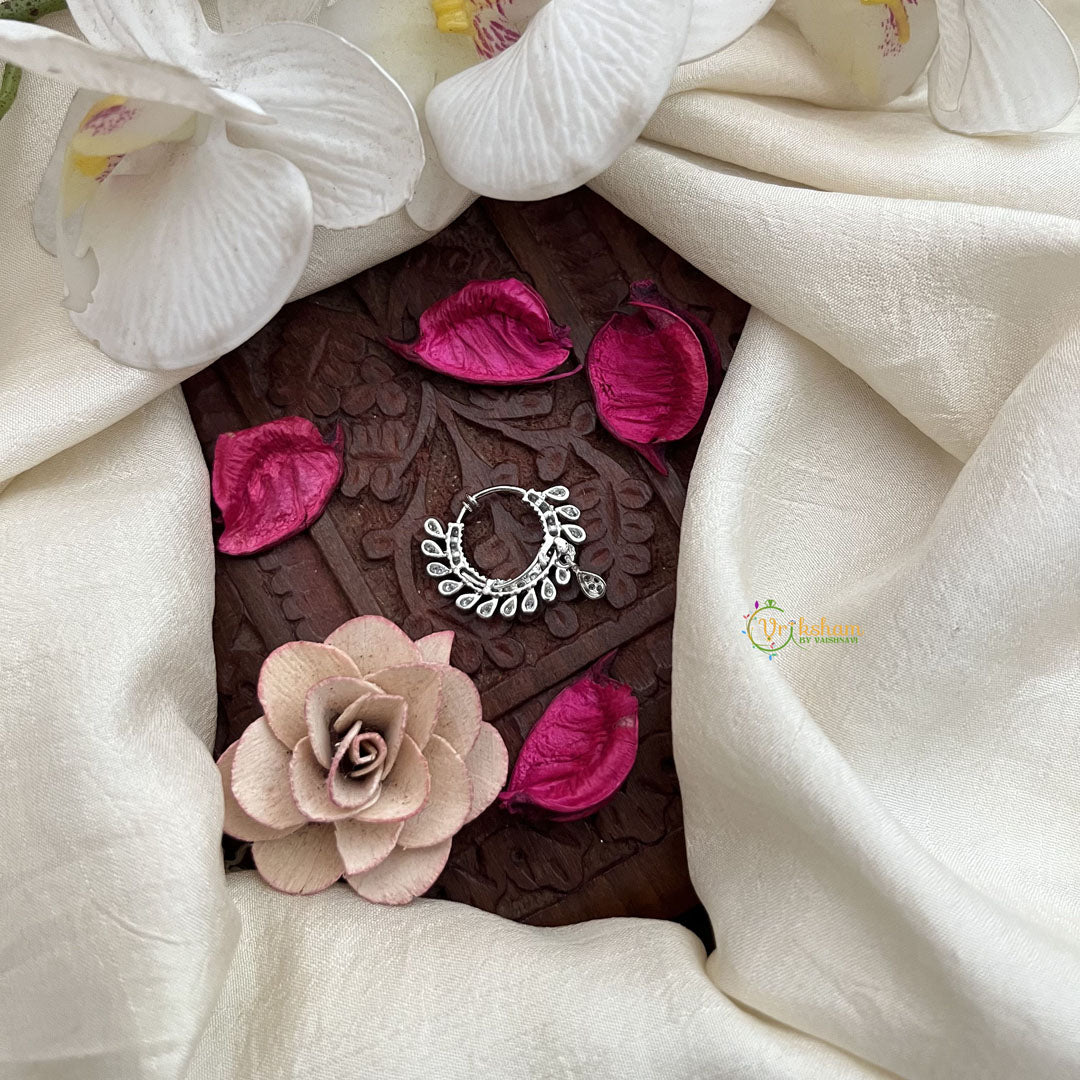 The Vriksham Bridal Leaf Style Nathni in silver features a graceful leaf design embellished with sparkling CZ stones. This press-on nose pin offers a secure and comfortable fit, blending traditional bridal elegance with modern ease. Its sophisticated style adds a radiant accent to your wedding ensemble, enhancing your look with timeless beauty and refined charm.