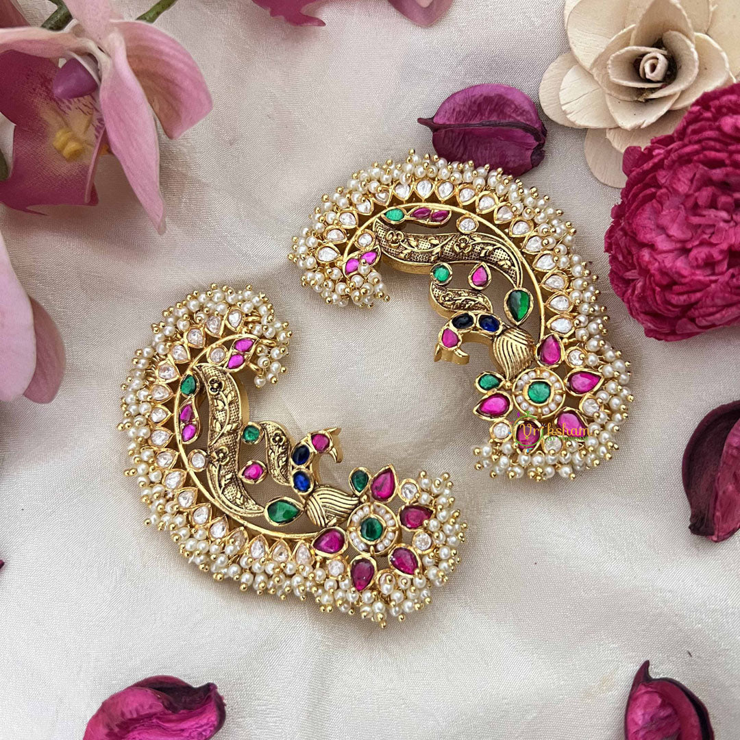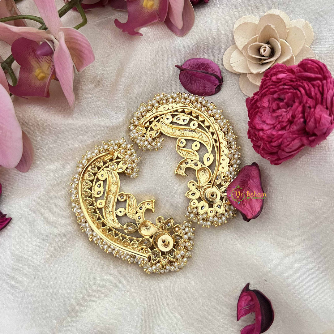 Color, shades, texture displayed may slightly vary from the actual product due to photography limitations. We humbly request you to consider these variations. We try Elevate your elegance with the Vriksham Royal Peacock Kundan Jadau Jhumkas, exquisitely crafted with intricate peacock motifs and adorned with lustrous pearls. The detailed maatil design is complemented by matching ear cuffs, creating a harmonious and regal accessory set perfect for special occasions. This sophisticated jewelry merges traditional craftsmanship with timeless beauty, enhancing your ensemble with a graceful, luxurious touch.our best to deliver the product pictures to 99% similar to the actual product. BEWARE of IMAGE RE-USAGE/COPYRIGHT VIOLATION across the INTERNET. This image belongs to www.vrikshamindia.com only. It is authentically taken by our in-house photographers in natural light without any editing or filters in place and is copyrighted to us. Any stealing/infringement or usage of this pic for sales/advertisement purposes is subject to legal action.