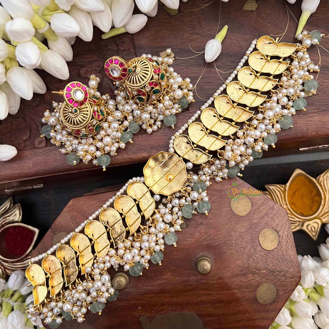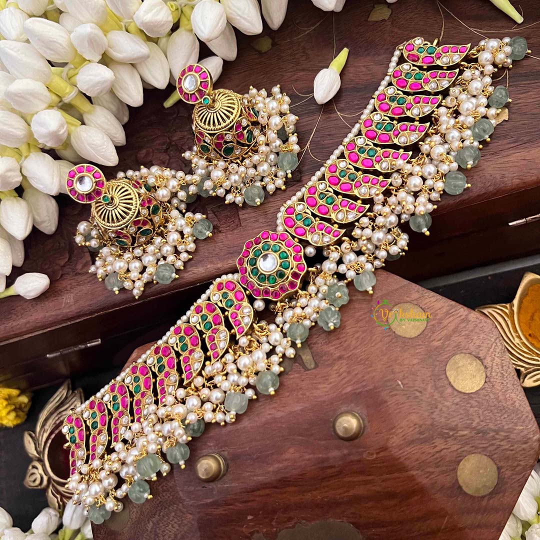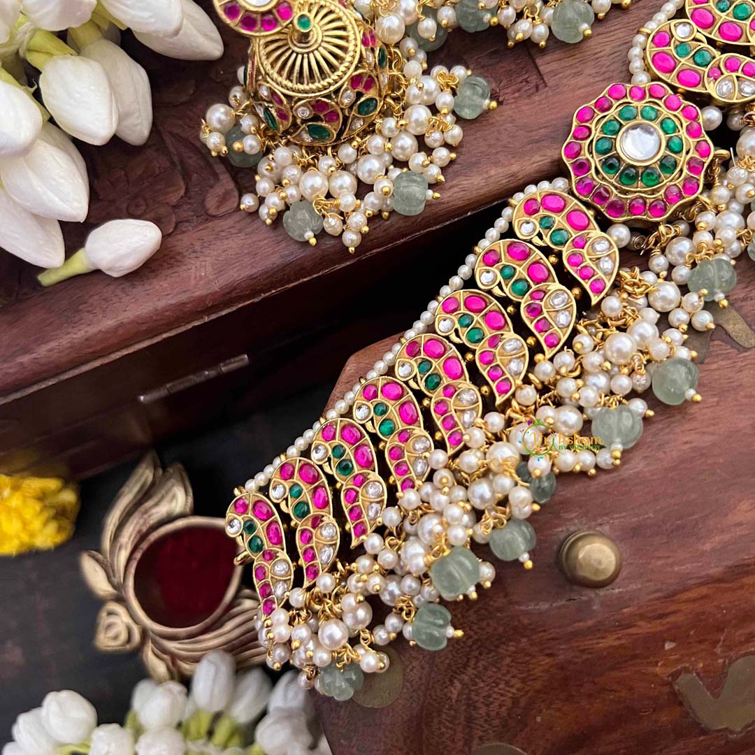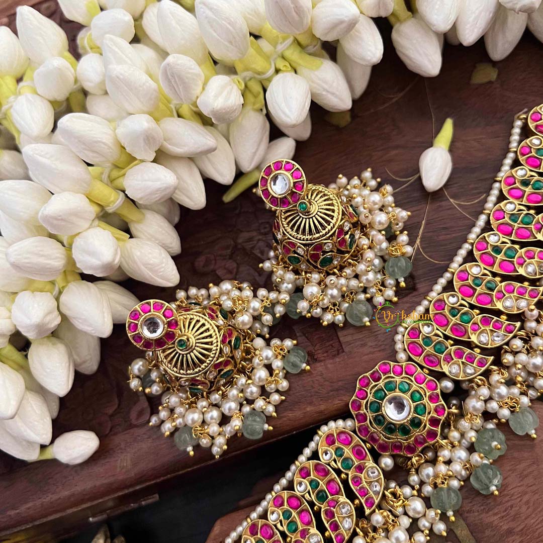 Captivate with this stunning Bridal Peacock Motif Cluster Choker Short Neckpiece, a breathtaking embodiment of bridal magnificence. The iconic peacock—revered symbol of beauty, prosperity, and grace—dominates the design in an elaborate cluster arrangement, accented with rich red, verdant green, and pristine white gemstones that harmonize beautifully. Complementary green beads and luminous pearls weave throughout, creating a cohesive palette of refined elegance and dimensional depth. The choker cut hugs the collarbone with commanding presence, striking the perfect balance between boldness and sophistication. Expertly crafted for brides and discerning jewelry enthusiasts, this neckpiece radiates opulence and cultural authenticity. An extraordinary choice for weddings, festive celebrations, or those who seek jewelry that embodies timeless beauty, heritage significance, and uncompromising craftsmanship.