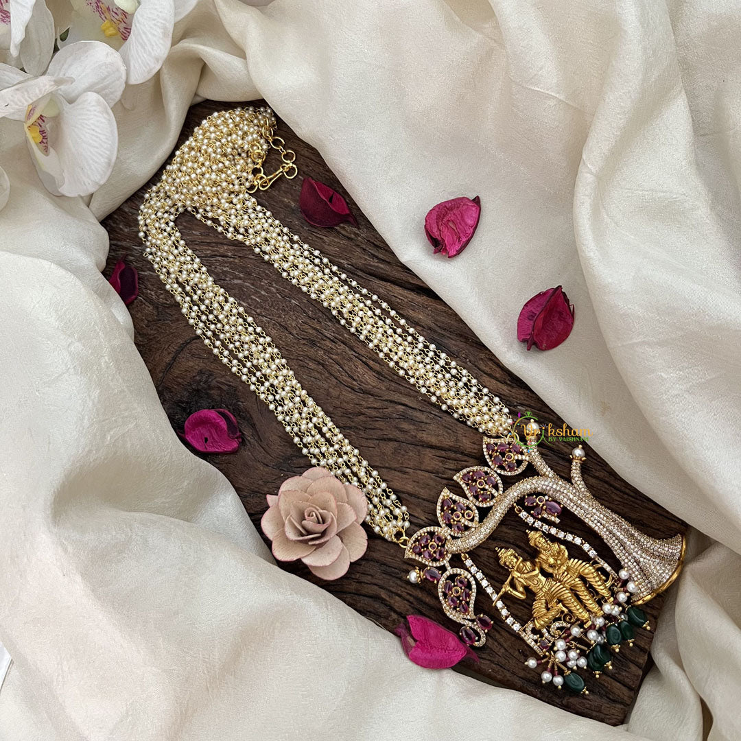 Elevate your bridal ensemble with the Vriksham Bridal Temple Style Radha Krishna Necklace. Featuring ten layers of lustrous pearls accented by rich red and green beads, this exquisite piece blends traditional artistry with timeless elegance. The intricate Radha Krishna motif adds a sacred charm, making it perfect for special occasions and weddings. Designed to complement regal attire, this necklace promises to enhance your grace with every wear.