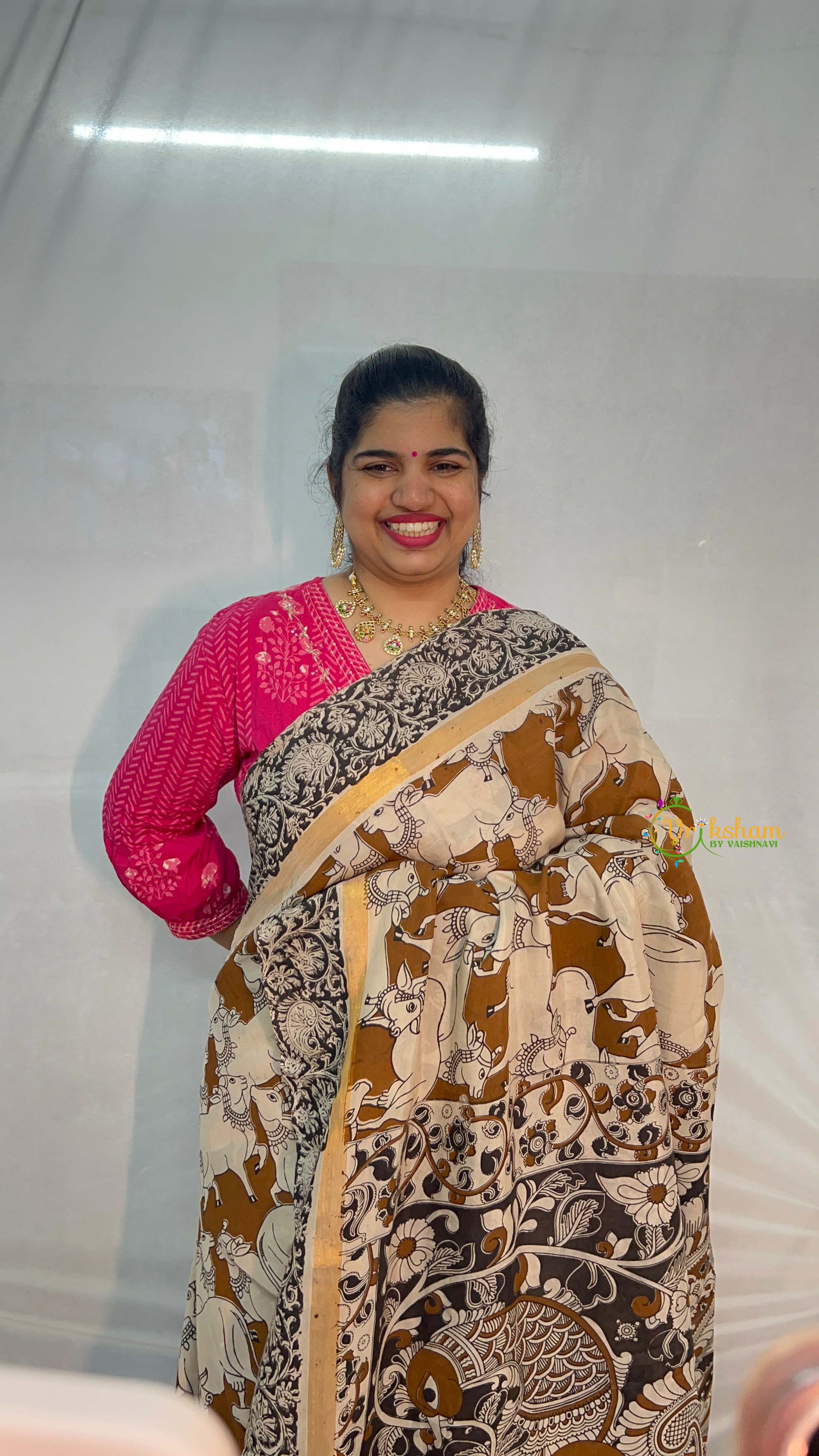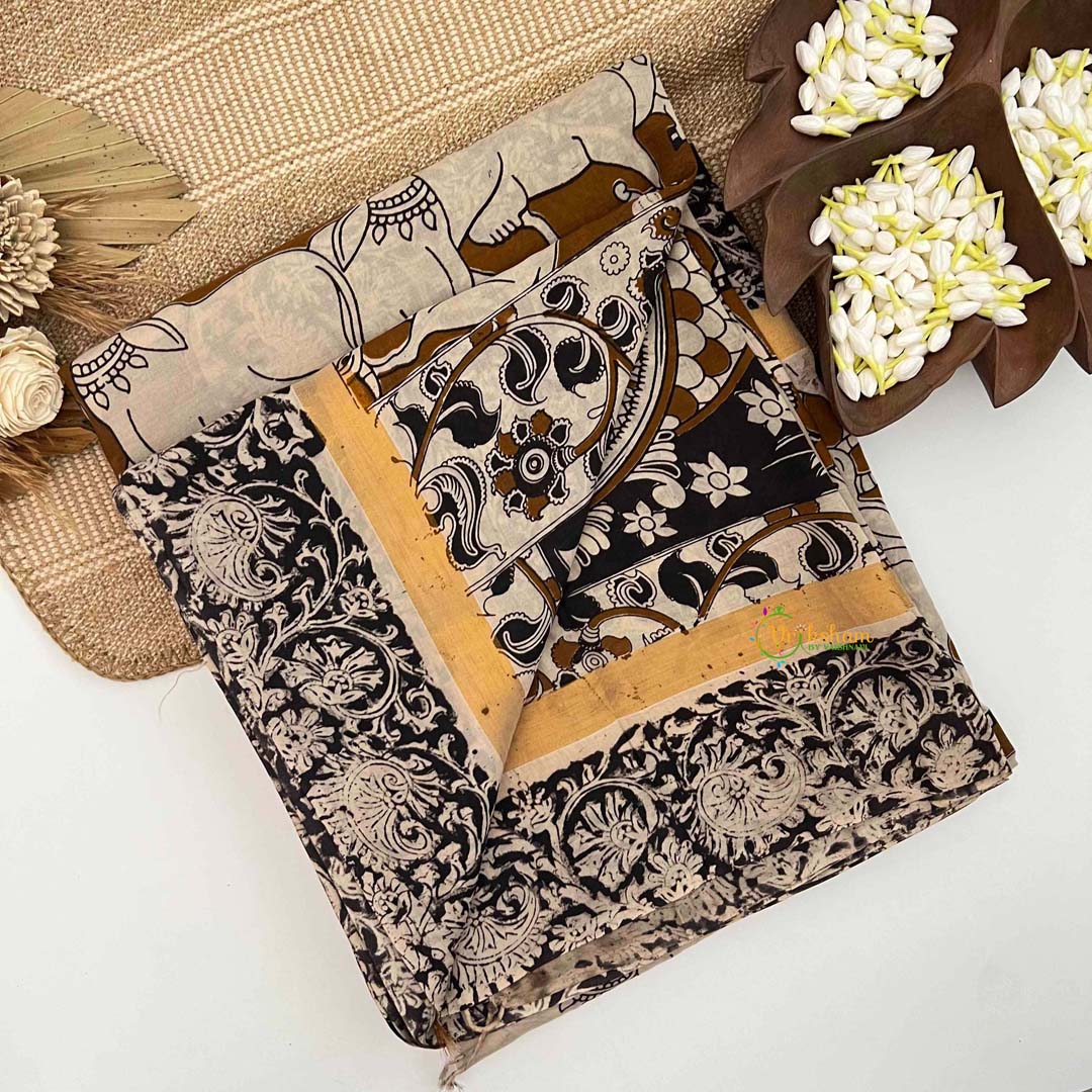 Embrace understated luxury with this exquisite Kalamkari saree in warm brown, where sacred Pichwai designs unfold with artistic precision and cultural reverence. Each motif is painstakingly hand-painted using traditional techniques, honoring the spiritual significance and masterful artistry inherent in authentic Kalamkari weaving. The distinctive black Gatti border provides elegant definition, creating a harmonious balance between warmth and sophistication. Ideal for festive celebrations, formal gatherings, and occasions demanding poised refinement, this saree seamlessly honors heritage while offering contemporary versatility. A distinguished investment that celebrates India's textile artistry while providing the discerning wearer with a garment of exceptional craftsmanship, cultural depth, and enduring, timeless elegance.