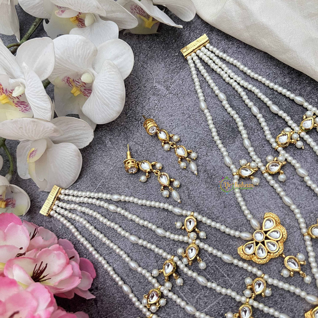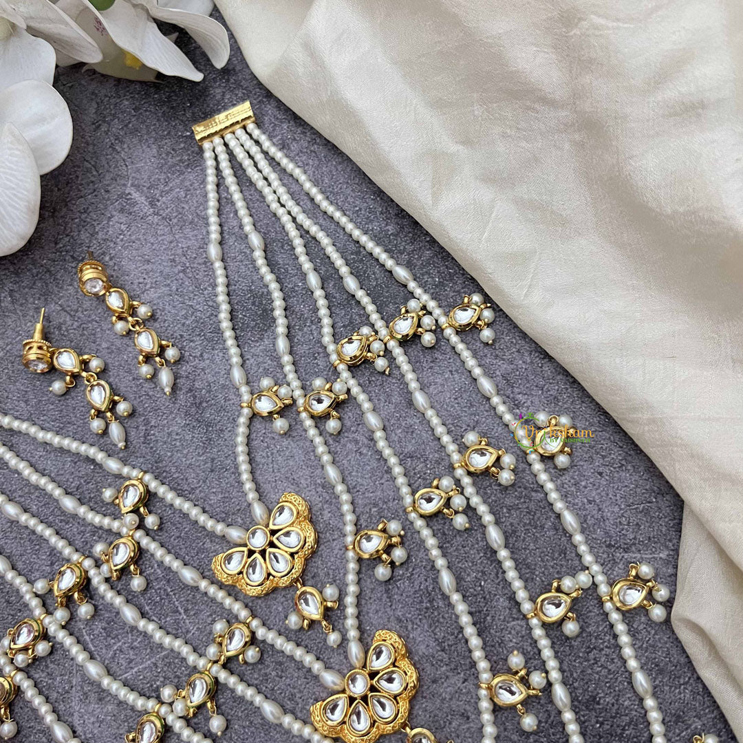 The Vriksham Butterfly Bliss Multi Strand Kundan Neckpiece features five layers of lustrous pearls intertwined with intricate Kundan detailing. This long, elegant design captures a sophisticated essence, perfect for adding a graceful and distinguished touch to your ensemble.
