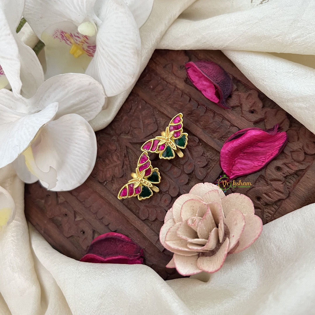 The Vriksham Butterfly Bloom Kundan Jadau Press Bugadi in red, green features a delicate butterfly-inspired design enhanced with intricate kundan and jadau craftsmanship. This sophisticated accessory adds a graceful and timeless elegance to traditional attire, perfect for elevating your look on festive and special occasions.