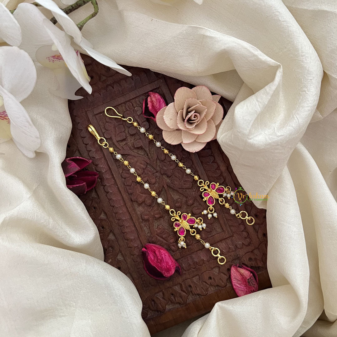 Indulge in luxury with the exquisite Vriksham Butterfly Single Strand Kundan Jadau Pearl Maatil-Red necklace. Made with intricate kundan and jadau work, this single strand necklace exudes elegance and sophistication. The stunning red pearls add a touch of glamour and opulence to any outfit. Elevate your style with this one-of-a-kind piece.