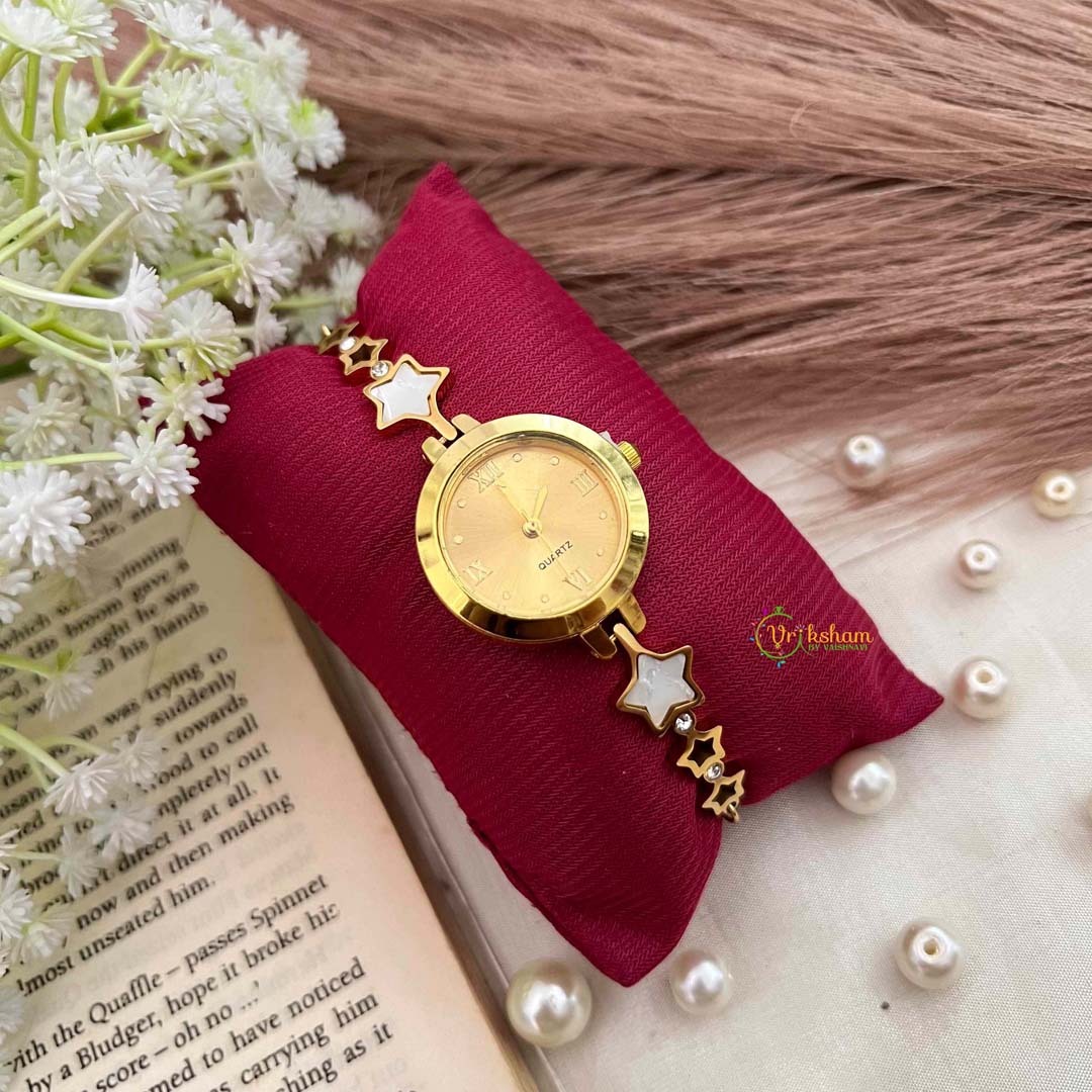 Elevate your wrist with this enchanting celestial-inspired bracelet watch, where golden charms and delicate star links converge to create a piece of wearable poetry. The hollow star design allows light to filter through, casting ethereal shadows that shift throughout your day, while the inlaid gold charms add layers of visual intrigue and luxury. Each element has been thoughtfully positioned to celebrate the cosmos and the infinite possibilities it represents, appealing to the dreamer with refined taste. The bracelet structure offers comfortable elegance, transitioning seamlessly from day to evening wear with effortless grace. This sophisticated timepiece transcends ordinary accessories, serving as a personal reminder of wonder and aspiration. Perfect for the woman who finds inspiration in the stars and expresses her individuality through jewelry that tells a celestial story, it's a treasured companion that combines timeless craftsmanship with cosmic allure.
