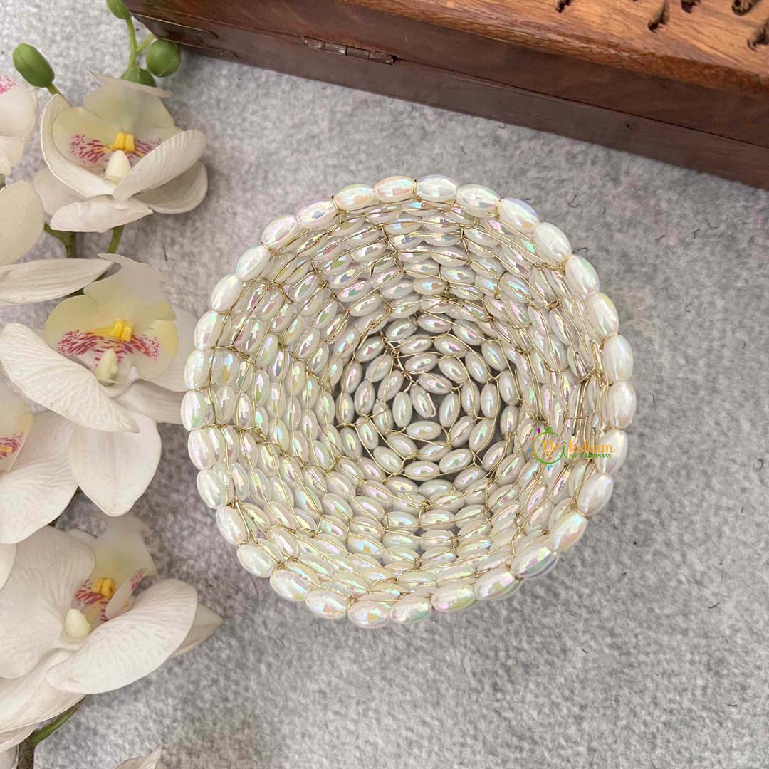 Capture ethereal beauty with this celestial shimmer ivory round bun maker, a dreamy accessory that evokes starlit elegance. The soft ivory palette combined with shimmering embellishments creates an enchanting glow, perfect for those seeking understated luminosity. The rounded clutch-inspired silhouette adds contemporary flair while the integrated hair bun cage provides dependable support throughout your day. Ideal for weddings, evening events, and occasions where ethereal sophistication is desired, this piece transforms your updo into a celestial-inspired crown. A refined selection for those who appreciate subtle radiance and wish to infuse their hairstyle with otherworldly charm and graceful allure.