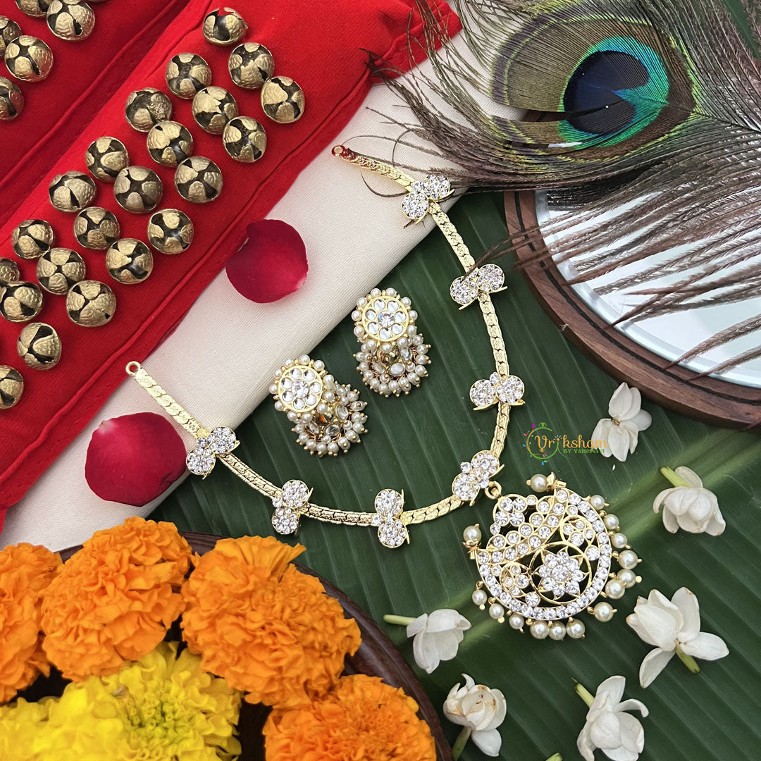 The Vriksham Chand Bali Pendant White Crystal Temple Necklace with Manga Short Neckpiece and pearls combines traditional design with elegant detailing. Featuring a classic Chand Bali pendant adorned with sparkling white crystals and complemented by a short neckpiece accented with pearls, this piece offers a sophisticated and graceful look perfect for special occasions.