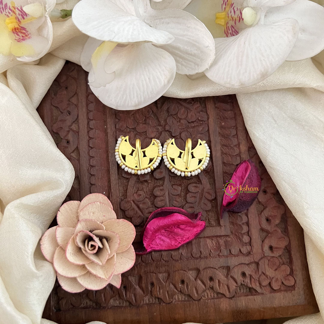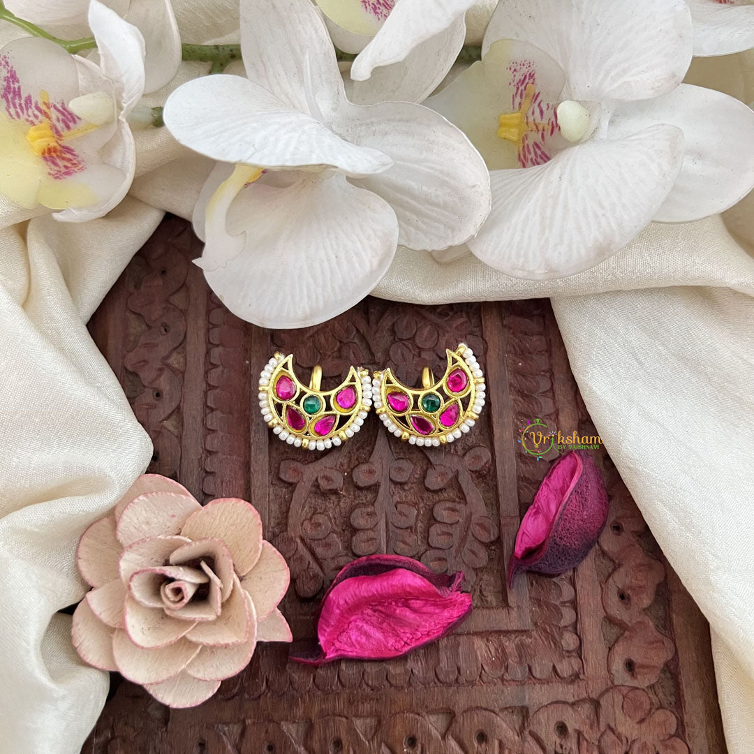 The Vriksham Chand Bali With Pearl Kundan Jadau Press Bugadi in red, green features a classic chand bali design adorned with delicate pearls and intricate kundan and jadau craftsmanship. This sophisticated accessory adds timeless elegance to traditional outfits, making it perfect for enhancing your look on festive and special occasions.