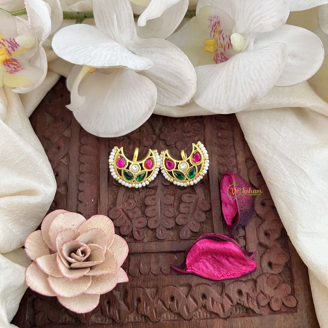 The Vriksham Chand Bali With Pearl Kundan Jadau Press Bugadi in red, green, and white features a classic chand bali design adorned with delicate pearls and intricate kundan and jadau craftsmanship. This sophisticated accessory adds timeless elegance to traditional outfits, making it perfect for enhancing your look on festive and special occasions.