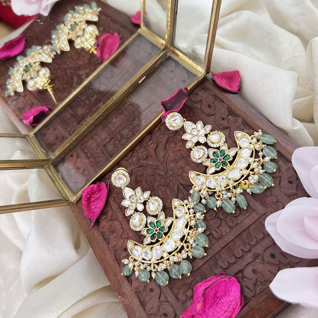 Exquisitely designed Chandbali danglers featuring an elegant floral motif adorned with vibrant green accents. The delicate aqua green beads create a refined contrast, cascading with graceful movement. These sophisticated earrings blend traditional Chandbali architecture with contemporary color sensibility, offering a distinguished accessory that transitions effortlessly from ceremonial occasions to curated evening ensembles with artistic finesse.