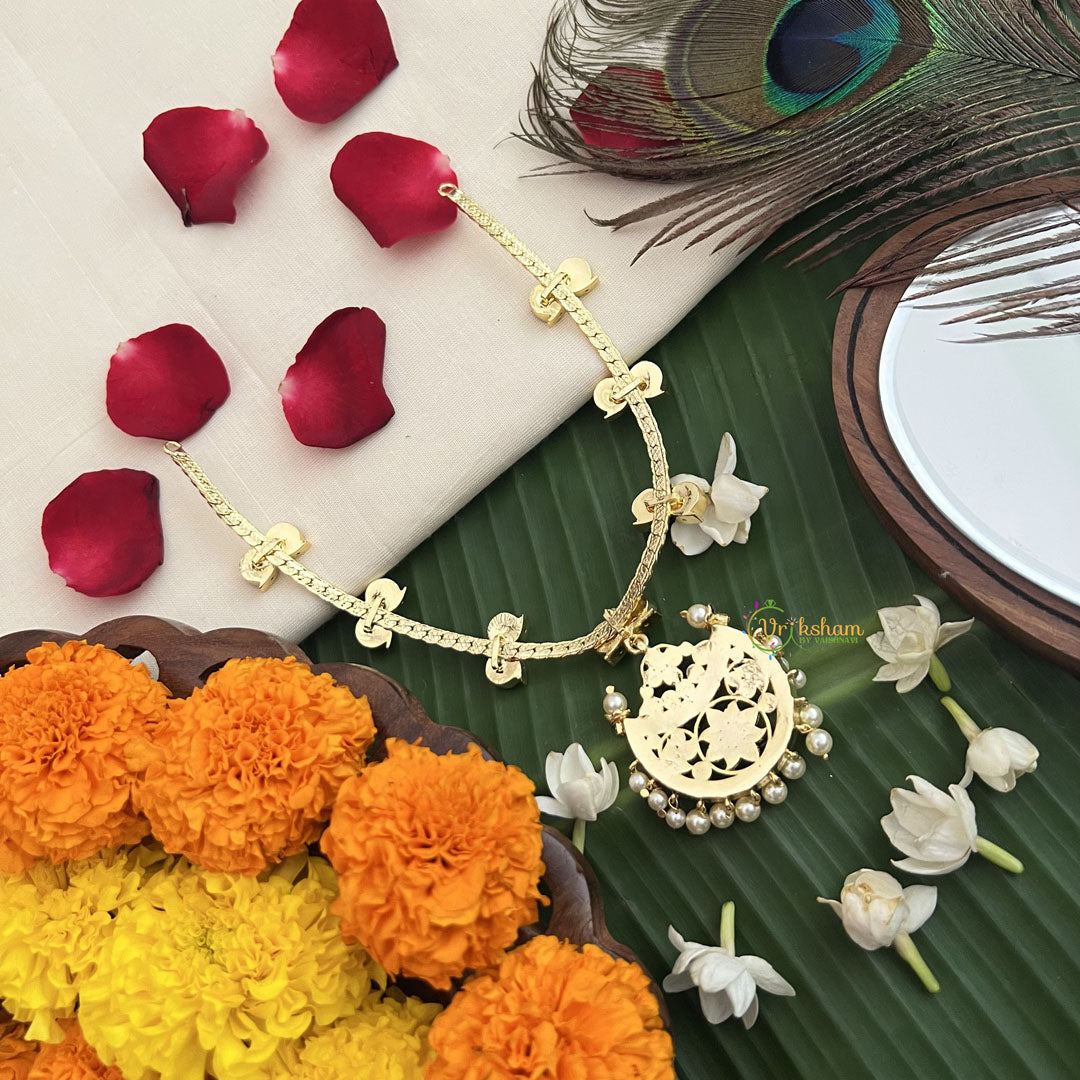 The Vriksham Chandbali Style Black Kemp Stone Pendant Short Neckpiece features a classic Chandbali design with a bold black Kemp stone centerpiece, elegantly accented by pearls. This sophisticated piece adds a timeless charm to any outfit, perfect for enhancing both traditional and modern styles with subtle grace.