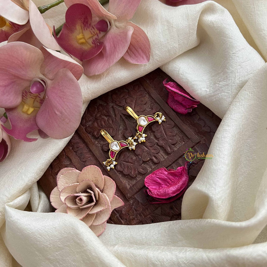 The Vriksham Chandrika Style Kundan Jadau Press Bugadi exemplifies elegant artistry with its harmonious combination of red and white tones, enriched by delicate pearls. Crafted with refined Kundan and Jadau techniques, this piece reflects timeless sophistication and cultural heritage. Ideal for formal events, it adds a graceful and distinguished touch to your ensemble.