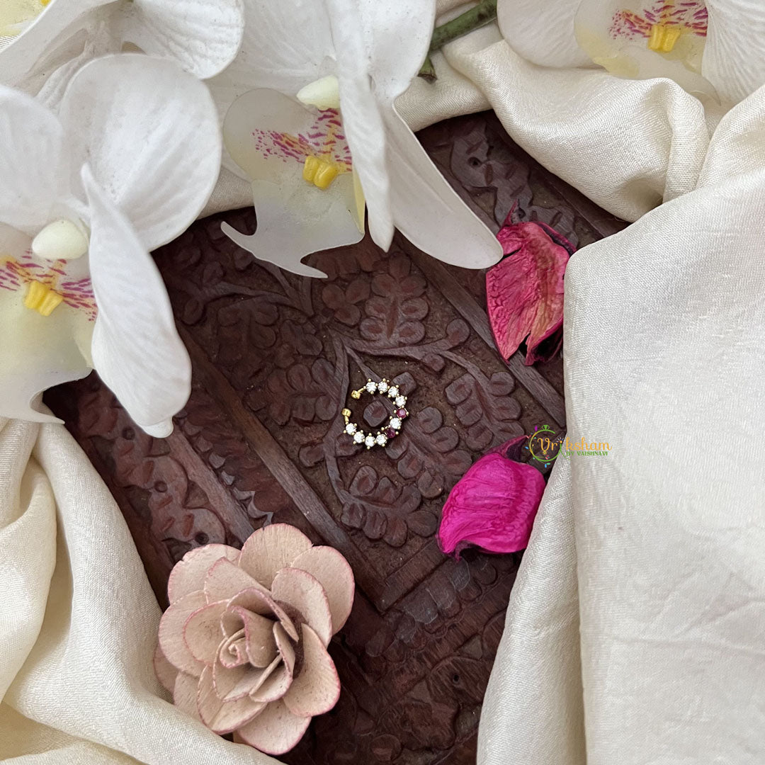 The Vriksham Charulata Floral Septum Ring-2 in red and white showcases intricate floral design accented with rich red and white tones. This sophisticated piece combines detailed craftsmanship with elegant color contrasts, offering a timeless accessory that enhances your style with subtle grace.