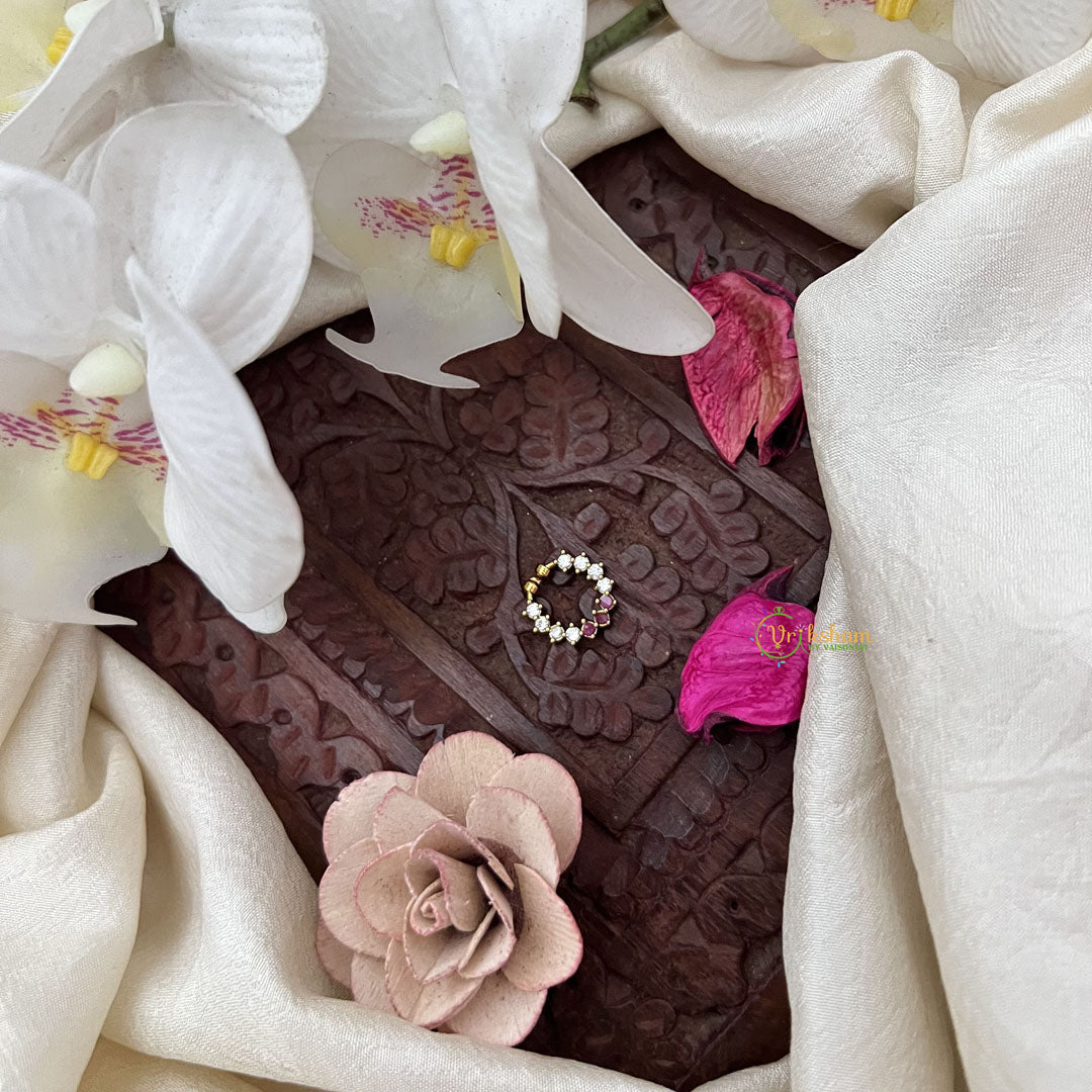 The Vriksham Charulata Floral Septum Ring in white and red beautifully blends delicate floral motifs with subtle color accents. Crafted to offer an elegant and refined aesthetic, this piece adds a sophisticated touch to your look, perfect for those who appreciate timeless artistry and graceful design.