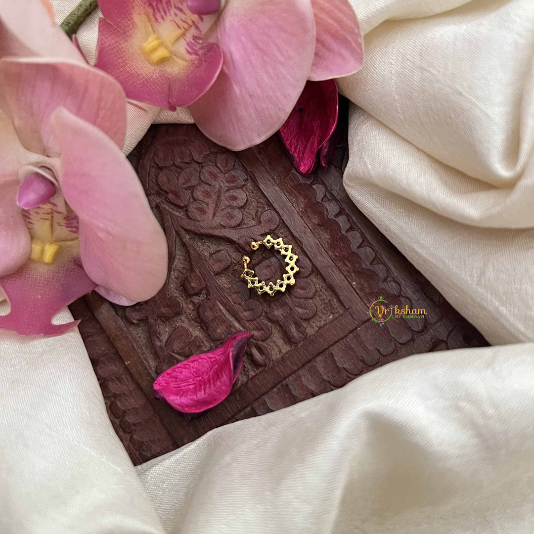 The Vriksham Charulata Floral Septum Ring in white features intricate floral craftsmanship with elegant white accents. This refined piece embodies timeless beauty and sophistication, offering a graceful accessory to elevate your style with subtle charm and delicate artistry.