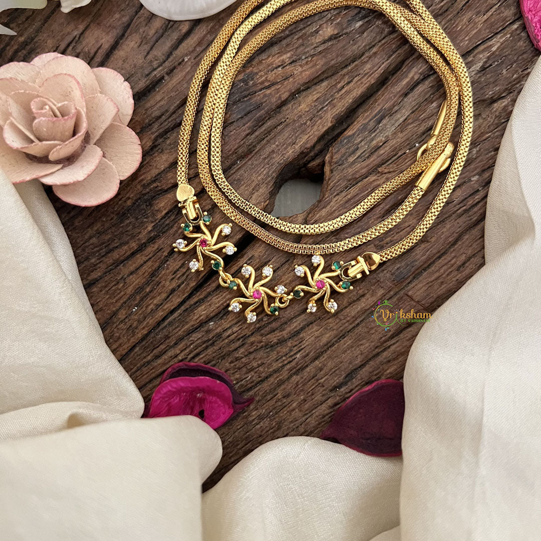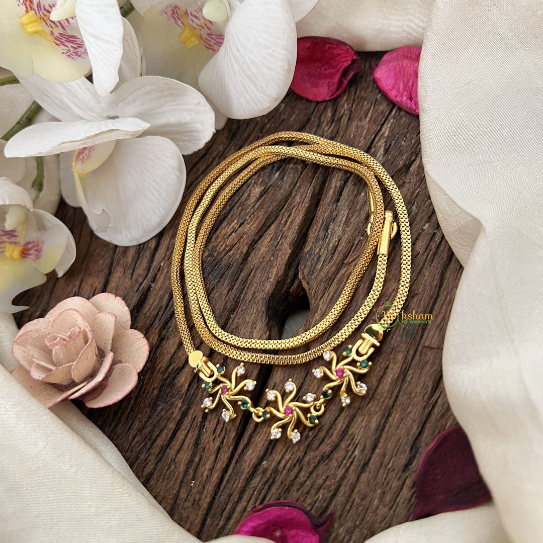 The Vriksham Chic Floral Design Moggapu Gold Chain in white red offers a sophisticated blend of modern style and classic floral elegance. Its refined craftsmanship and sleek design make it a perfect accessory to elevate any elegant outfit with subtle charm.