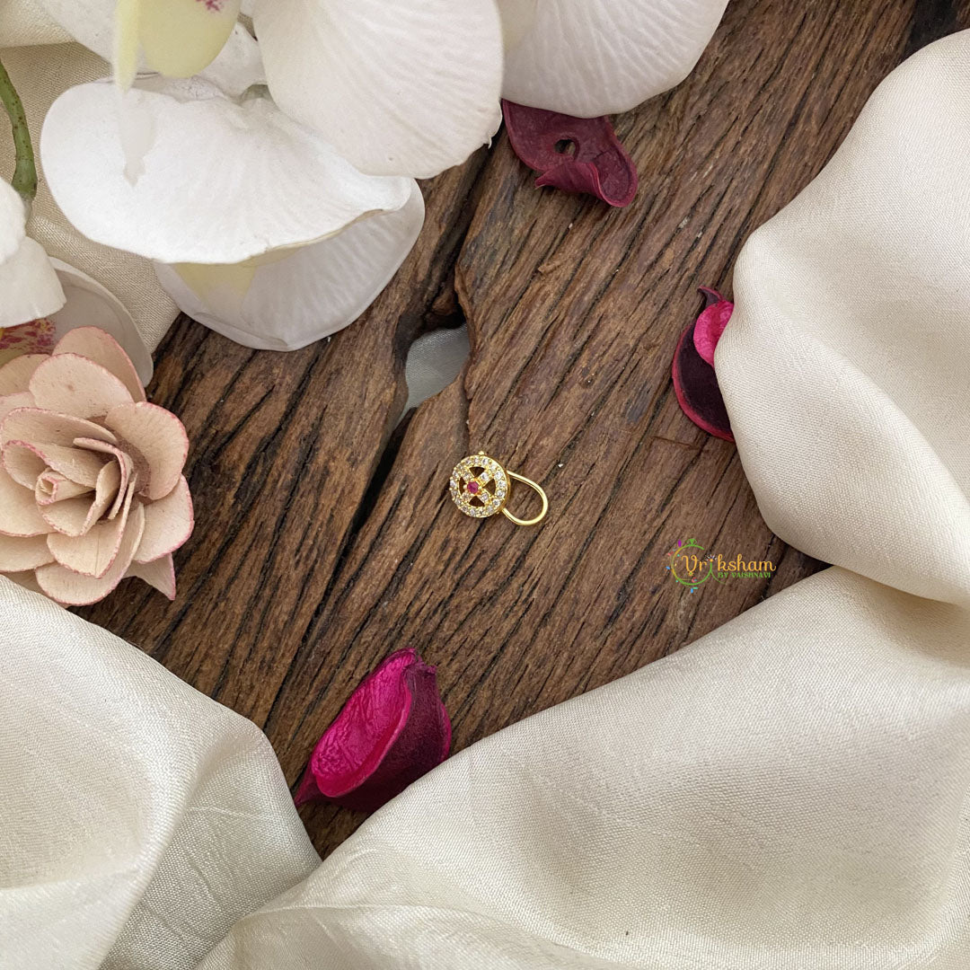 Add a touch of elegance and sophistication to your look with our Vriksham Circle Shape AD Stone Nath/Nose pin. Crafted with exquisite white red sparkling AD stones, this nose pin is the perfect accessory for any occasion. Upgrade your style and stand out with this luxurious piece.