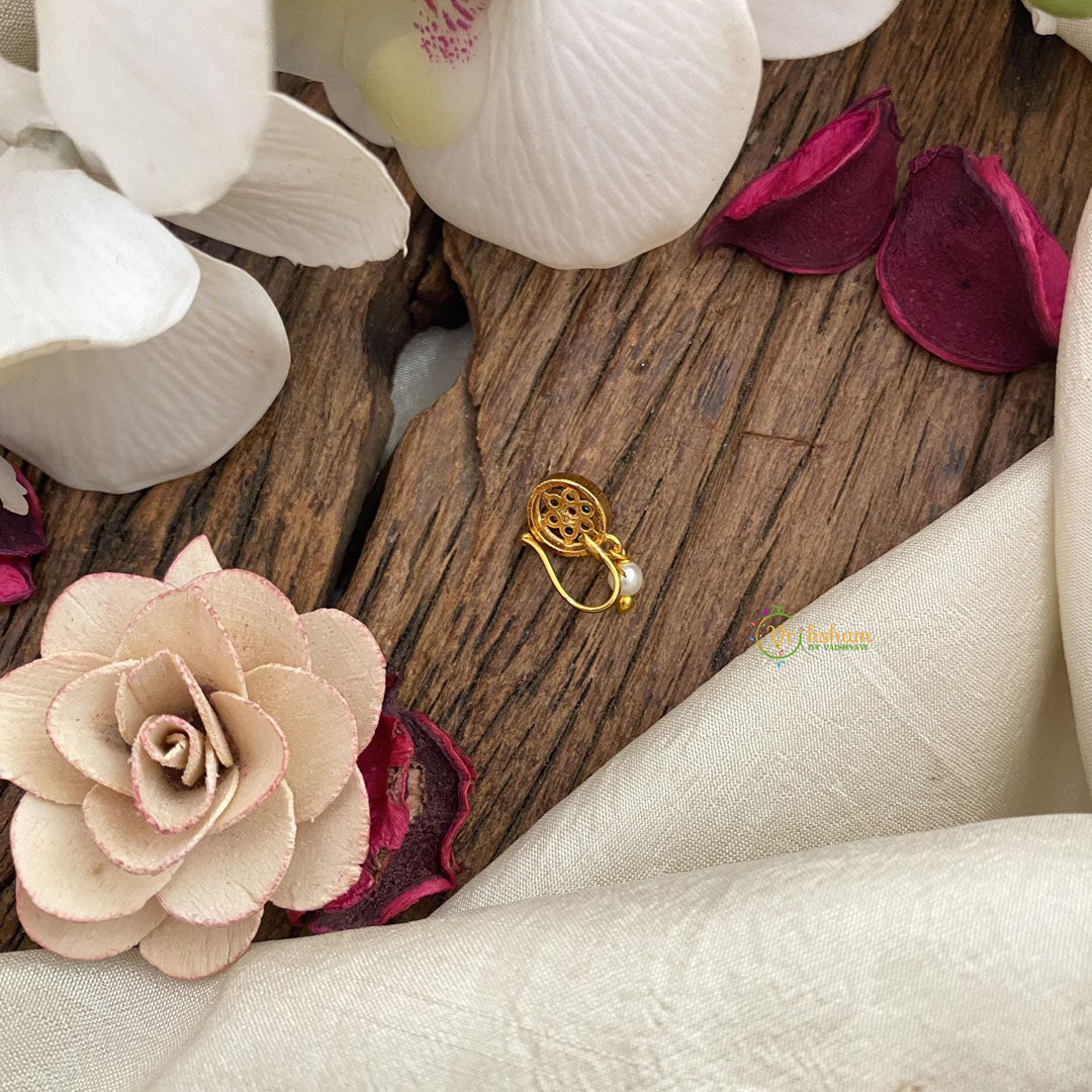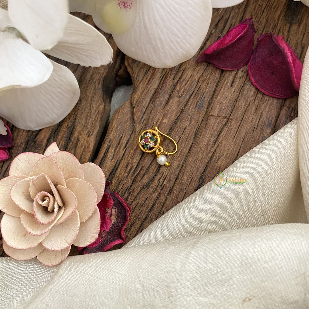 Indulge in luxury with our exquisite Vriksham Circle Shaped AD Stone Nath/Nose pin in white, red, and green. Adorn yourself with this elegant, exclusive piece, crafted with precision and adorned with sparkling stones. Make a statement with this stunning accessory, perfect for any occasion.