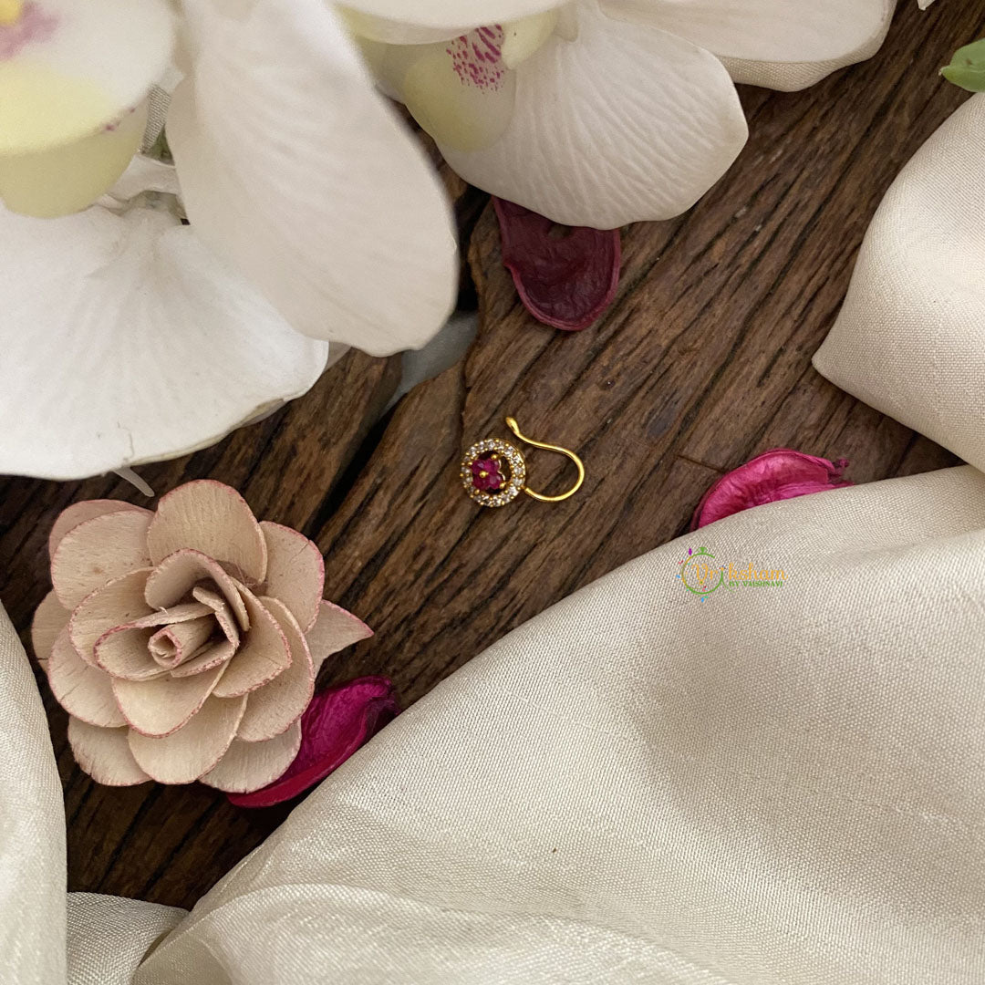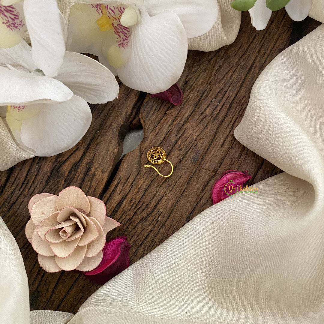 Elevate your look with the Vriksham Circle Shaped Floral AD Stone Nath/Nose pin. Adorned with intricate floral designs and sparkling AD stones, this elegant piece adds a touch of luxury and sophistication to your ensemble. A must-have for any fashion-forward individual.