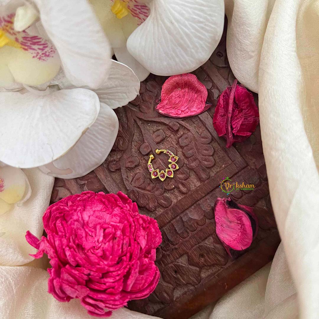 Embrace timeless allure with this classic five-leaf gold-plated septum ring, a distinguished expression of Indian bridal craftsmanship. The graceful leaf motif is beautifully adorned with vibrant red AD stones that radiate warmth and elegance against the luxurious gold plating. The meticulous artisanal work showcases exceptional skill in every detail, creating a refined accessory that transcends fleeting trends. Ideal for weddings, festivals, and special occasions, this sophisticated piece brings authentic cultural heritage and enduring beauty to your bridal ensemble. A treasured investment in traditional jewelry design that celebrates nature-inspired elegance with contemporary luxury.