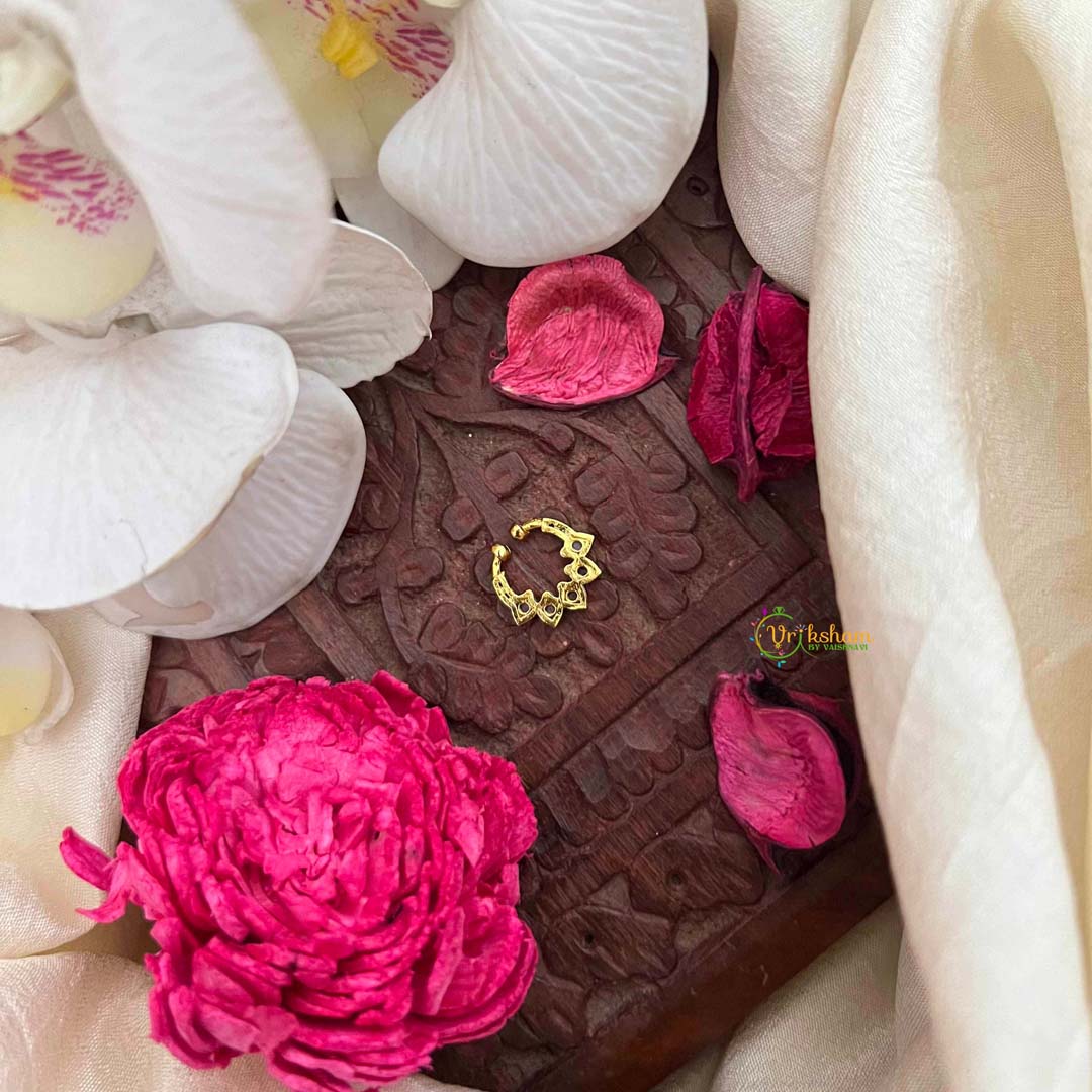 Golden Naths/Nose ring for Non - Pierced Nose. People who do not have piercing do not have to worry about not being able to wear naths. These nose rings helps people with non pierced nose also wear the same with a screw like holding. The moment you see the nath you will be able to understand how it will sit on the nose.