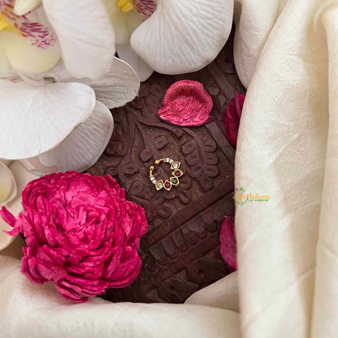Indulge in the splendor of this classic five-leaf gold-plated septum ring, a magnificent celebration of Indian bridal heritage. The graceful leaf design is adorned with a harmonious palette of white, red, and green AD stones that create a mesmerizing dance of festive colors and luminous brilliance. The luxurious gold plating provides an elegant backdrop that enhances each stone's radiant glow, while meticulous craftsmanship reveals exceptional artisanal excellence. Perfect for weddings, festivals, and cherished celebrations, this refined piece brings authentic cultural richness and timeless sophistication to your bridal ensemble. A treasured accessory that honors tradition while radiating contemporary elegance.
