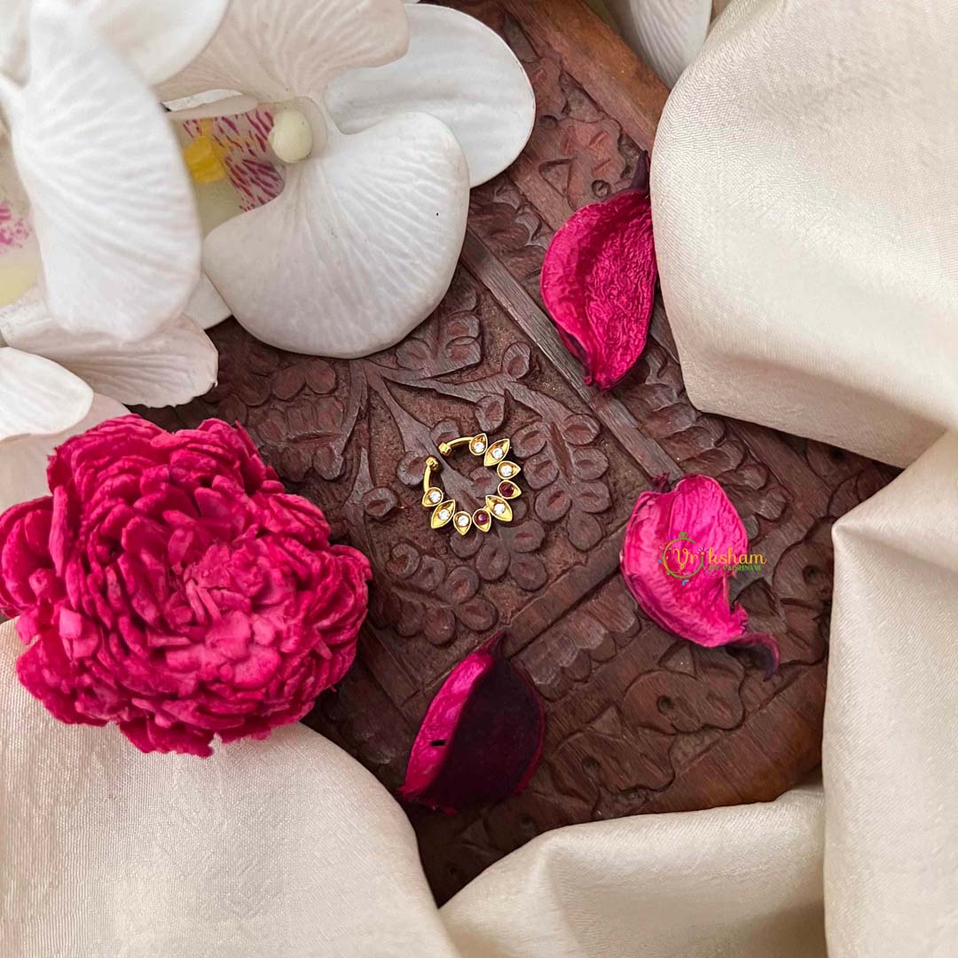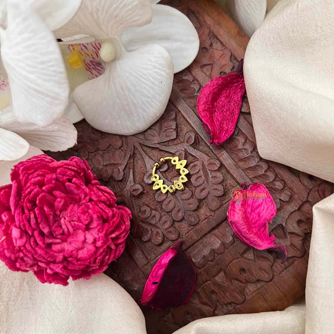 Experience the grace of this classic five-leaf septum ring, a sophisticated homage to traditional Indian bridal aesthetics. Embellished with pristine white AD stones that shimmer with ethereal brilliance, each leaf is meticulously crafted to capture light and movement. This refined piece showcases exceptional artisanal excellence, offering a versatile accessory for brides and jewelry connoisseurs seeking authentic cultural expression. Ideal for weddings, festivals, and milestone celebrations, the elegant leaf motif adds a touch of natural beauty and timeless charm to your ensemble. A distinguished investment in heritage craftsmanship that transcends fleeting trends.