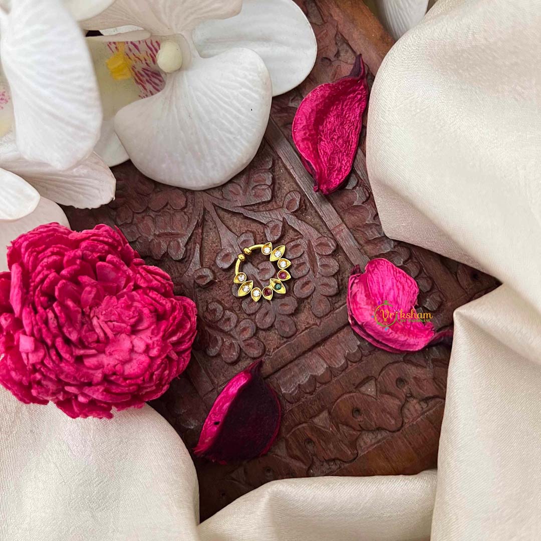 Experience the grace of this classic five-leaf septum ring, a sophisticated homage to traditional Indian bridal aesthetics. Embellished with pristine white AD stones that shimmer with ethereal brilliance, each leaf...