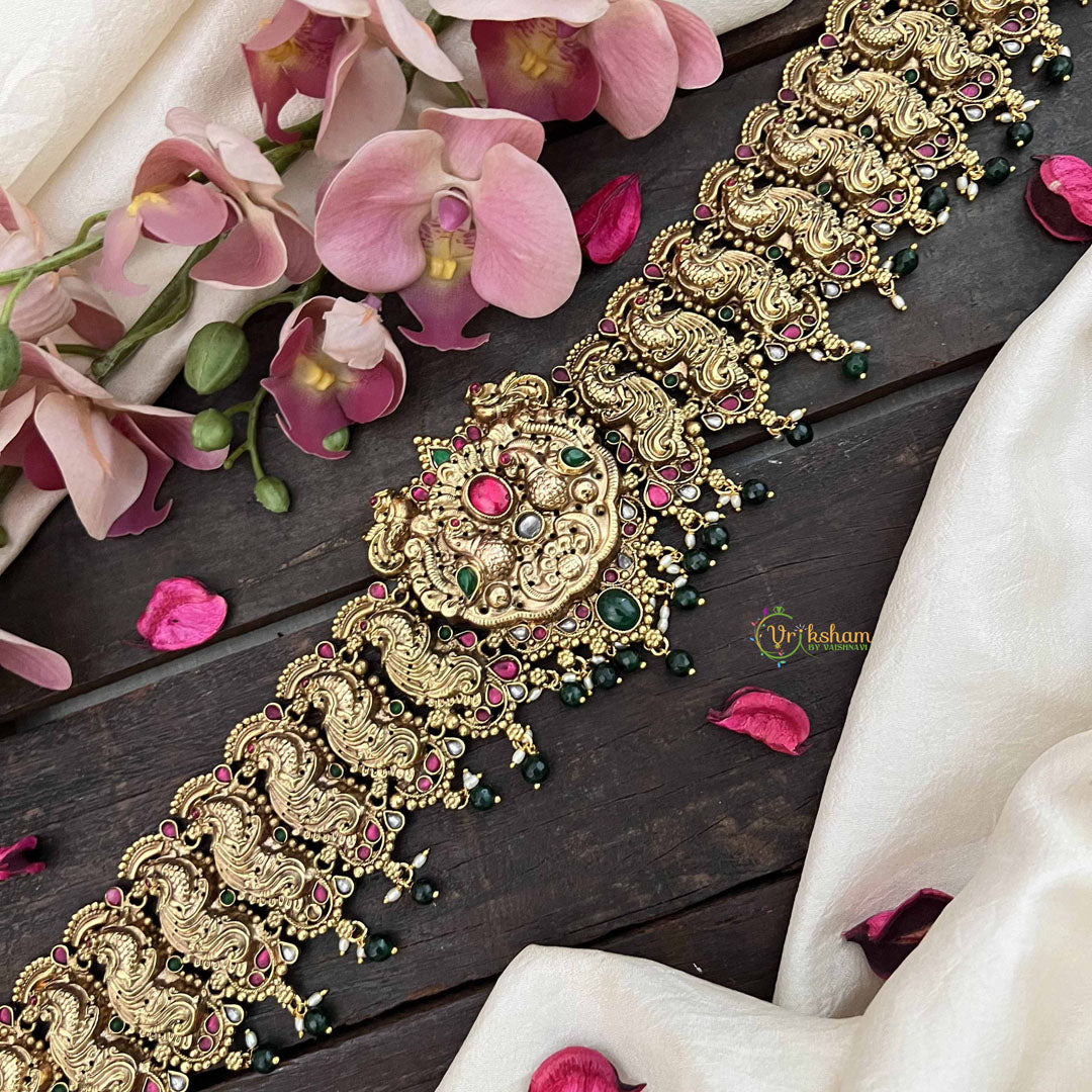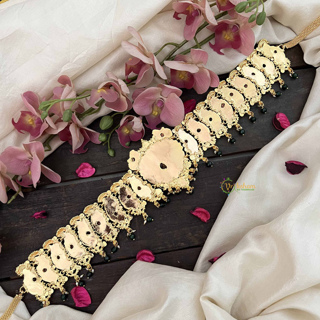 Celebrate your special moments with this exquisite bridal hip chain, a stunning fusion of traditional craftsmanship and timeless elegance. Featuring a majestic peacock design rendered in 1 gm gold, this piece drapes gracefully along the waist with refined sophistication. Adorned with lustrous green beads that echo the peacock's natural splendor, the hip chain creates a mesmerizing silhouette that complements bridal and festive ensembles beautifully. The intricate detailing showcases authentic South Indian jewelry artistry, making it an essential accessory for weddings and grand celebrations. This heirloom-quality piece symbolizes grace and prosperity, adding an enchanting finishing touch to your traditional attire while honoring centuries of jewelry-making heritage.