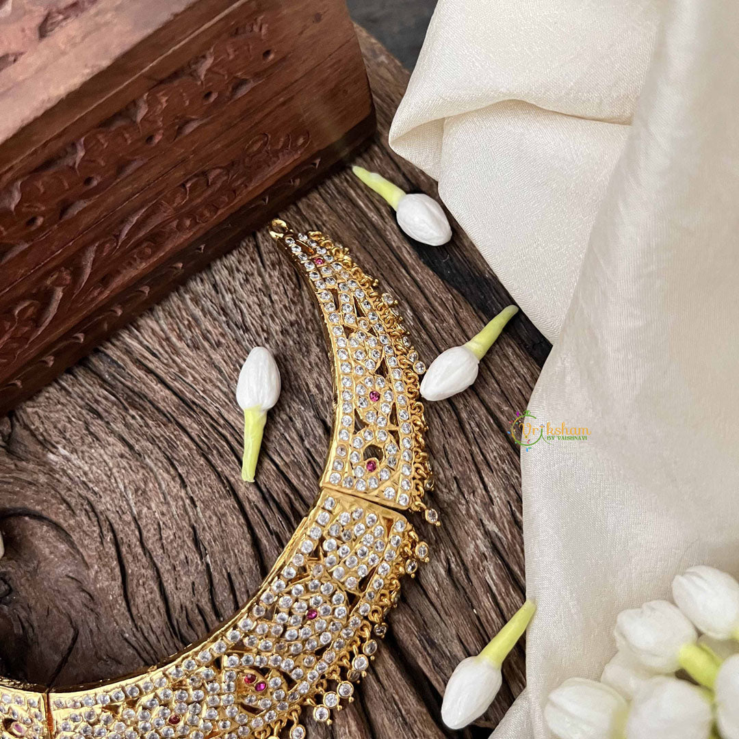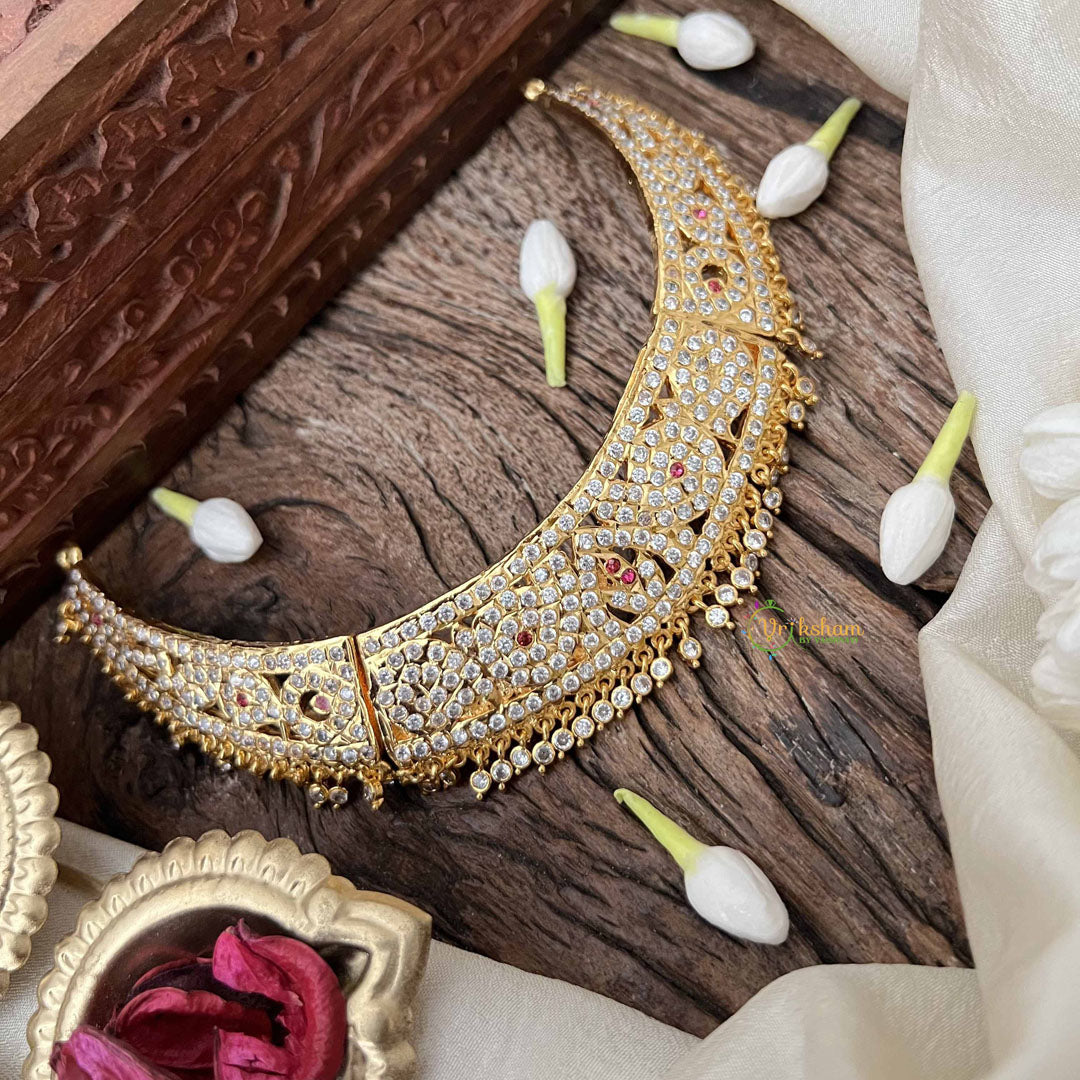 Celebrate bridal magnificence with this stunning choker neckpiece, where pristine white elegance meets vibrant crimson red accents. This short neckpiece combines classic bridal sophistication with a contemporary color palette, adorned with shimmering diamond drops that enhance its luminous appeal. The harmonious blend of white and red creates a striking visual statement, perfect for brides seeking distinctive elegance on their special day. The carefully positioned diamonds frame the neckline with refined brilliance, adding depth and dimension to the design. Versatile enough for weddings, celebrations, and formal occasions, this choker transcends seasonal trends. A meticulously crafted piece that honors bridal tradition while embracing modern sensibility, offering timeless beauty that becomes a cherished heirloom for generations to come.