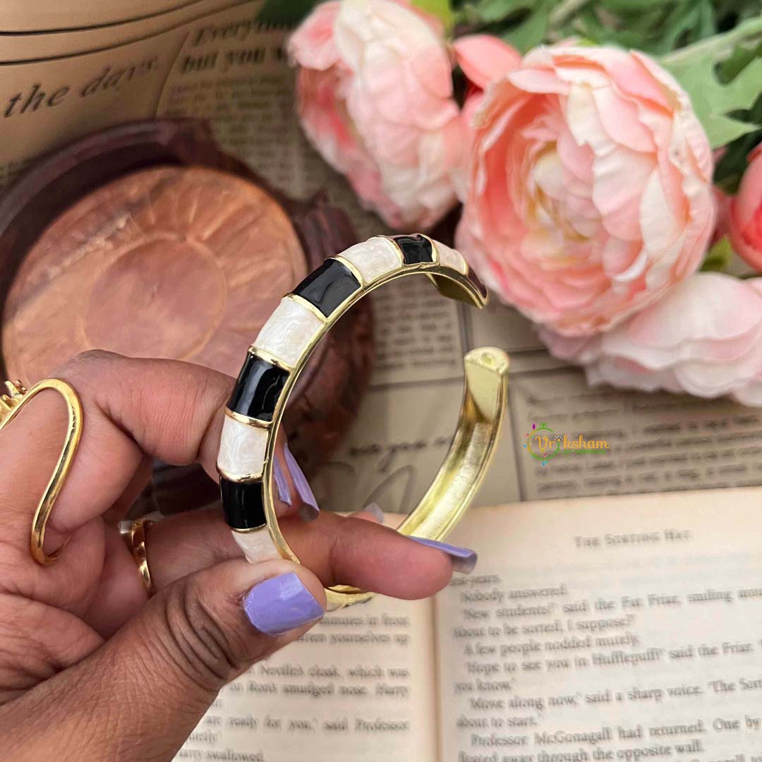 Embrace timeless elegance with this striking stackable kada bangle, featuring a classic checkerboard pattern in contrasting black and ivory enamel, accented with warm gold-tone detailing. The geometric precision of the checkerboard design creates visual sophistication while maintaining understated refinement, perfect for those who appreciate structured aesthetics. The monochromatic palette ensures exceptional versatility, coordinating seamlessly with any wardrobe and complementing all complexions with effortless grace. Gold-tone accents introduce subtle warmth and dimension, elevating the traditional checkerboard motif to contemporary luxury. Expertly executed enamel work demonstrates meticulous artisanal skill, with each square rendered with precision and care. Ideal for layering or wearing independently, this bangle adapts to your personal styling preferences with ease. A distinguished choice for the refined wearer, this stackable piece celebrates the enduring appeal of classic geometric design reimagined with modern sophistication, embodying timeless style and artistic excellence.