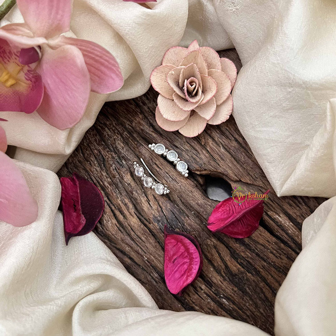 The Vriksham Classic CZ Bezel Ear Climber showcases a refined silver-plated minimalist design featuring precisely set cubic zirconia stones. This elegant stud earring adds a subtle yet sophisticated sparkle, making it an ideal accessory to elevate both everyday ensembles and special occasion looks with timeless grace.