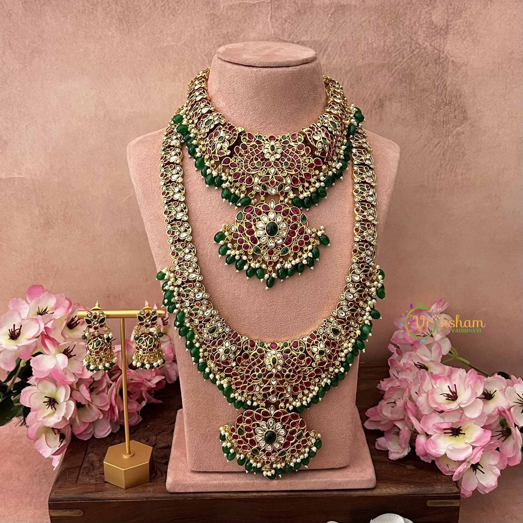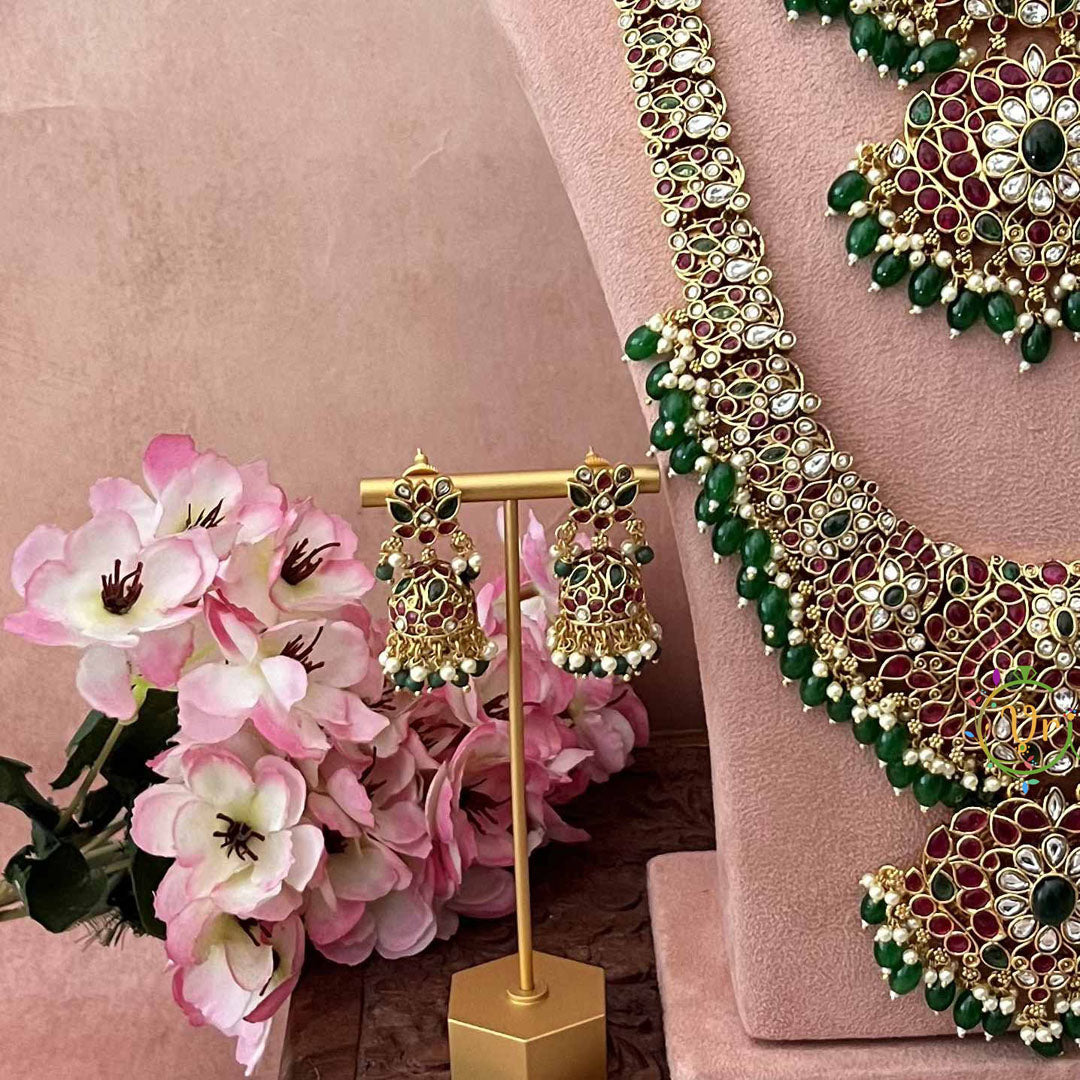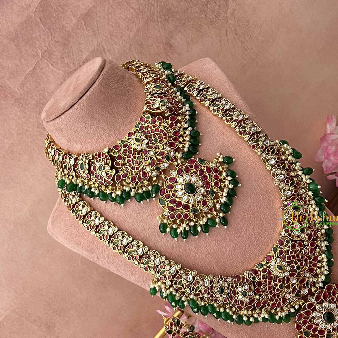 Embrace timeless elegance with this exquisite bridal set, featuring dual peacock and floral motifs that capture the essence of traditional craftsmanship. The rich green beadwork adds depth and sophistication to this stunning ensemble, perfect for your special day. Each piece is meticulously designed to complement your bridal look with grace and grandeur, blending classic artistry with refined aesthetics. This versatile set transitions beautifully from ceremony to celebration, making it an heirloom-worthy investment for the discerning bride.