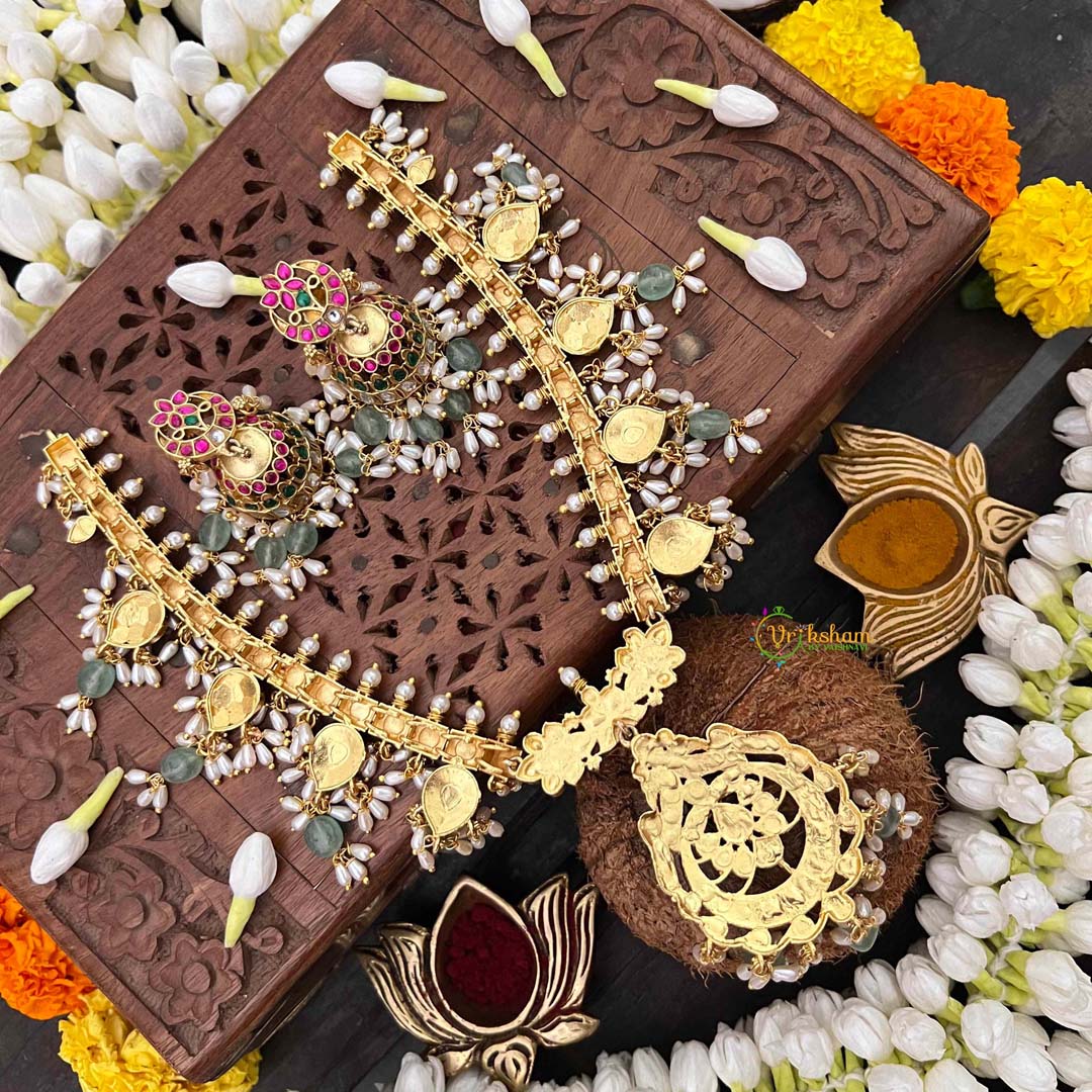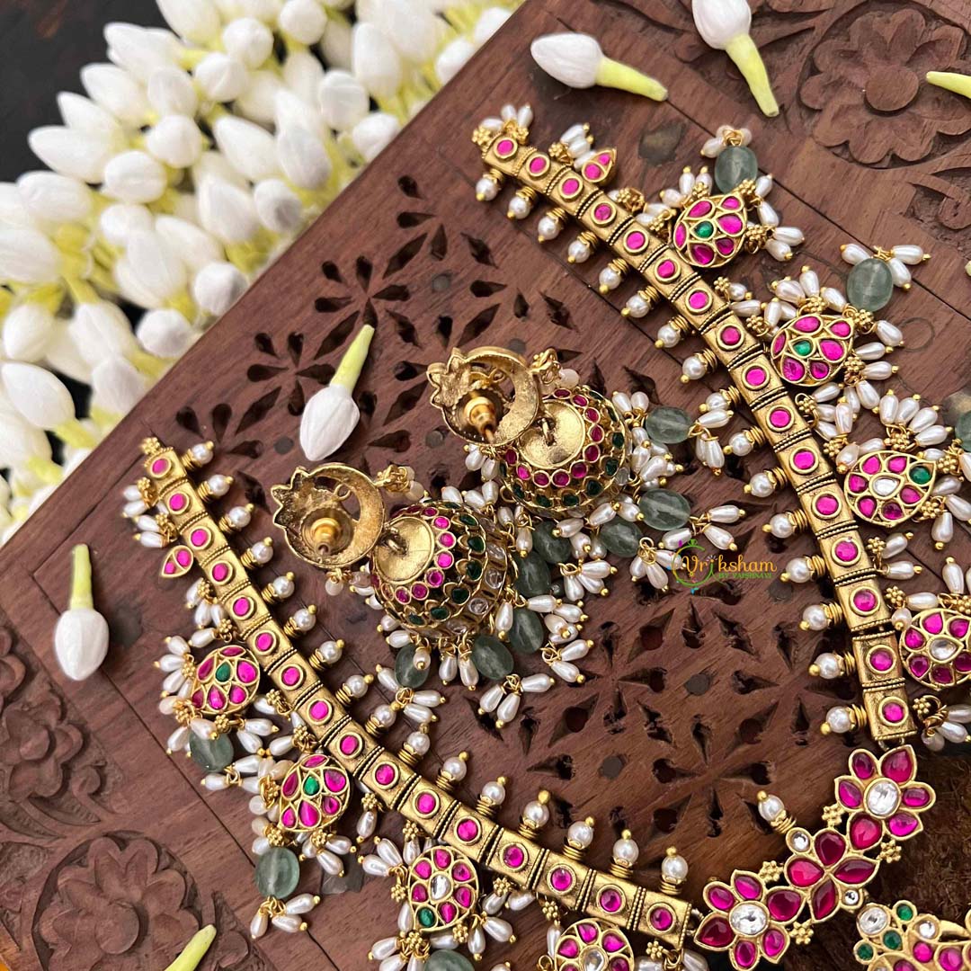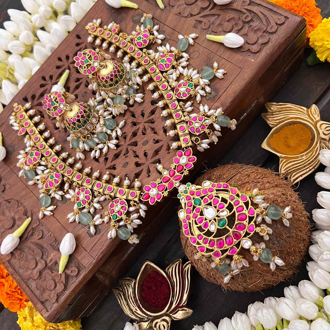 Celebrate timeless elegance with this Classic Floral Kundan Jadau Guttapusalu Short Neckpiece, a refined expression of traditional Indian jewelry mastery. Delicate floral motifs bloom across the design, meticulously crafted in kundan work and adorned with luminous rice pearls and verdant green beads. The distinctive guttapusalu granulation technique adds textural depth and vintage allure, while jadau setting guarantees each stone is individually secured with exceptional precision. The harmonious interplay of botanical elements and precious embellishments creates an understated yet commanding presence. Perfect for weddings, cultural celebrations, or those who treasure jewelry that honors ancestral artistry, this short neckpiece drapes beautifully along the collarbone. An enduring heirloom for those who appreciate authentic craftsmanship and timeless sophistication.