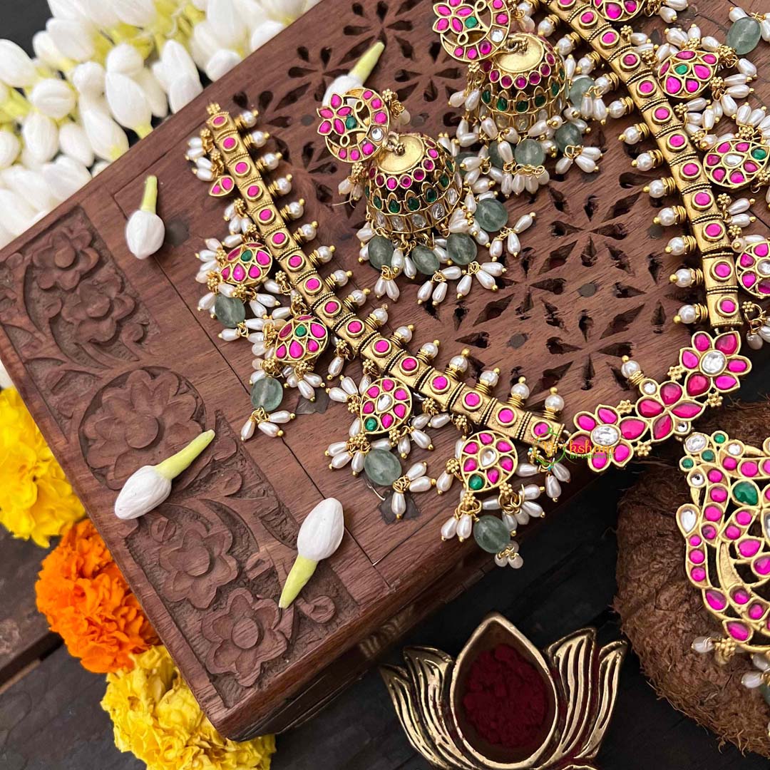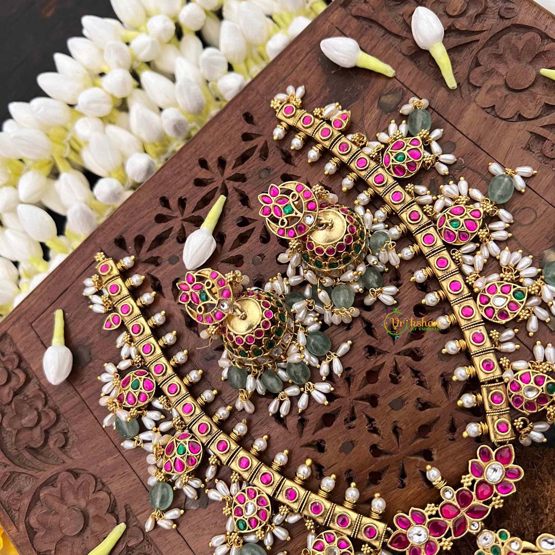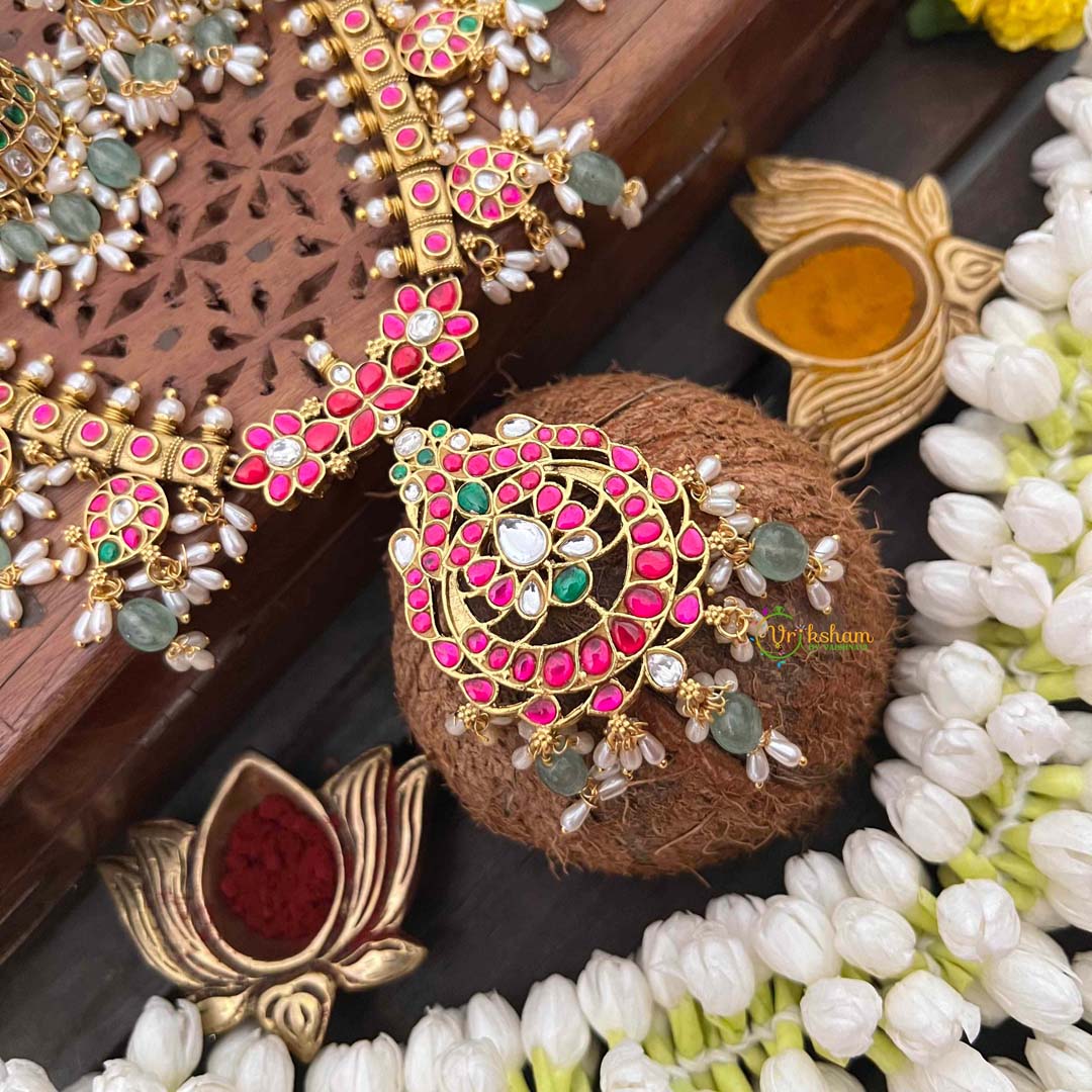 Celebrate timeless elegance with this Classic Floral Kundan Jadau Guttapusalu Short Neckpiece, a refined expression of traditional Indian jewelry mastery. Delicate floral motifs bloom across the design, meticulously crafted in kundan work and adorned with luminous rice pearls and verdant green beads. The distinctive guttapusalu granulation technique adds textural depth and vintage allure, while jadau setting guarantees each stone is individually secured with exceptional precision. The harmonious interplay of botanical elements and precious embellishments creates an understated yet commanding presence. Perfect for weddings, cultural celebrations, or those who treasure jewelry that honors ancestral artistry, this short neckpiece drapes beautifully along the collarbone. An enduring heirloom for those who appreciate authentic craftsmanship and timeless sophistication.