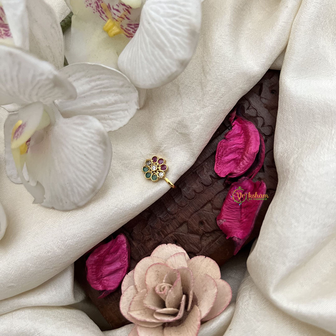 The Vriksham Classic Floral Round Nose Pin features a timeless floral design adorned with red, white, and green stones. Its press-on style ensures effortless comfort while adding a touch of classic sophistication to your look, perfect for enhancing any ensemble with subtle elegance.