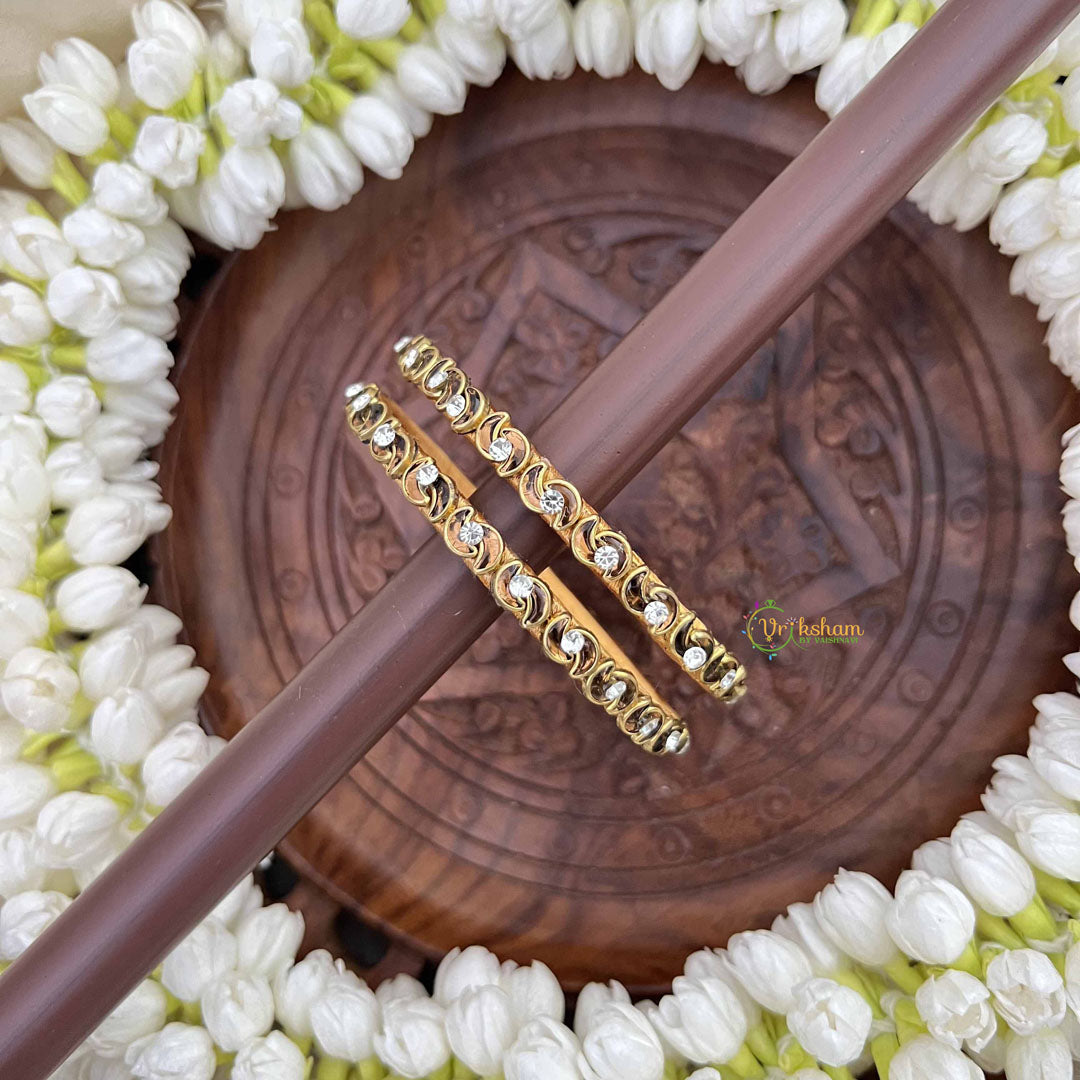 Elevate your traditional ensemble with these exquisite Classic Gold Finish Bangles, where timeless elegance meets contemporary design. Crafted with a lustrous gold finish and adorned with pristine white stones, these bangles radiate refined sophistication. Perfect for weddings, festivals, or everyday celebrations, they complement both ethnic and modern attire seamlessly. The carefully selected white stone embellishments add a touch of sparkle and grace to your wrist, making them an essential addition to any jewelry collection. Versatile, stunning, and eternally chic.